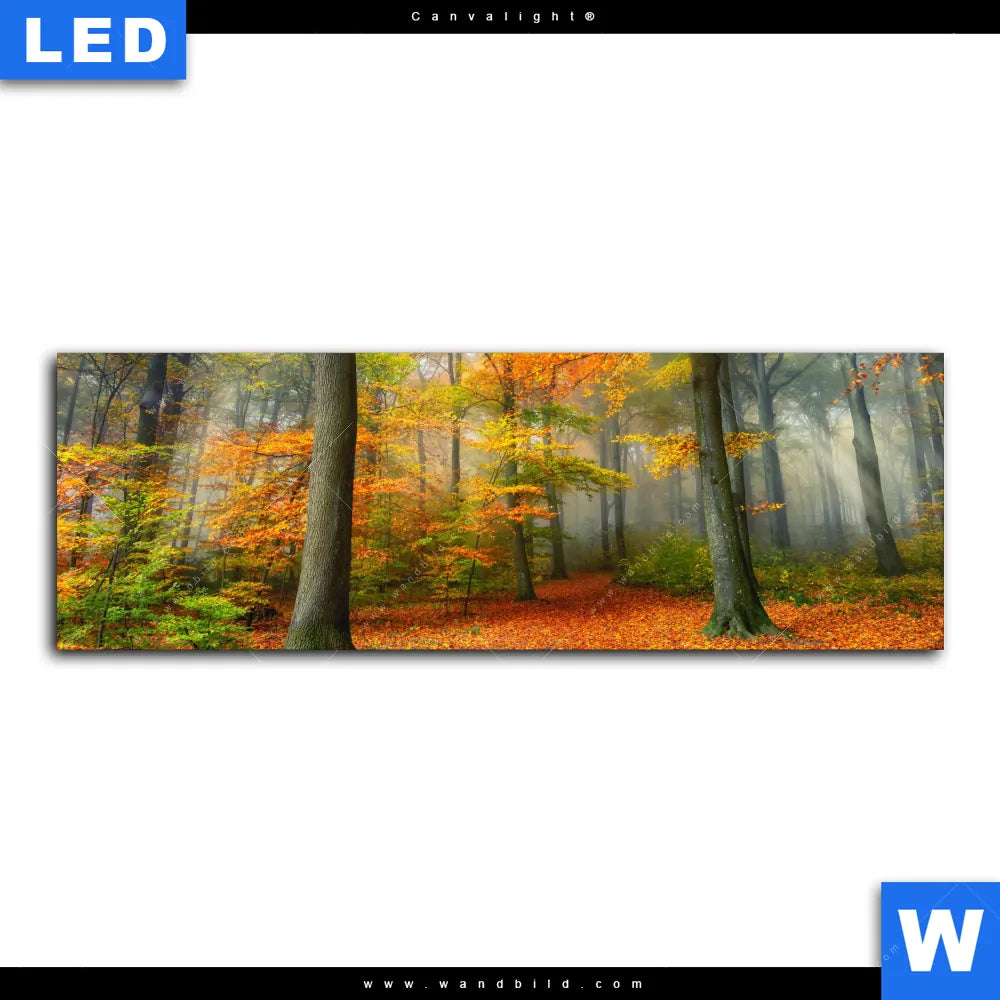 Canvalight® Leuchtbild | Herbstfarben im nebligen Wald | Panorama