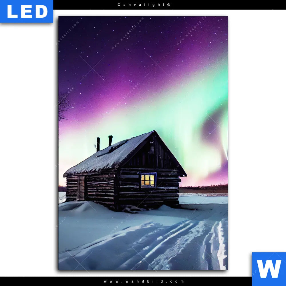 Canvalight® TEX Leuchtbild | Nordlichter über einem Holzhaus | Hochformat