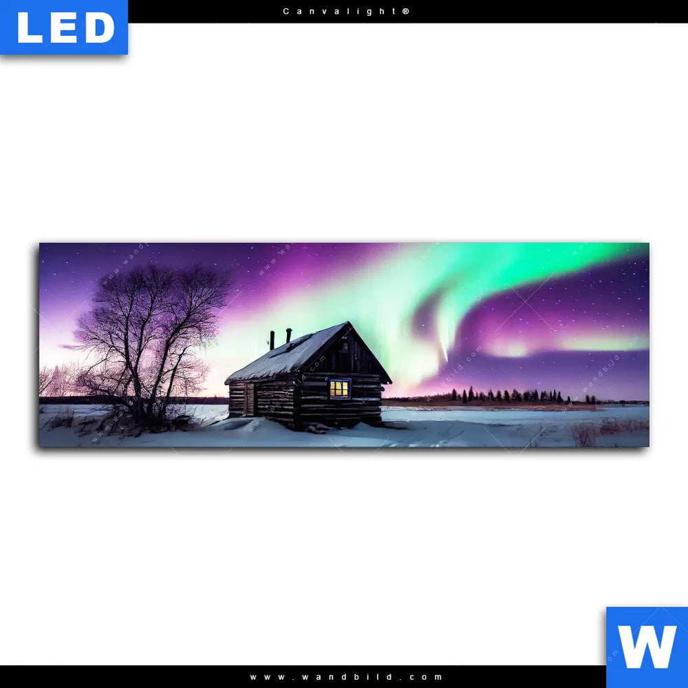 Canvalight® Leuchtbild | Nordlichter über einem Holzhaus | Panorama