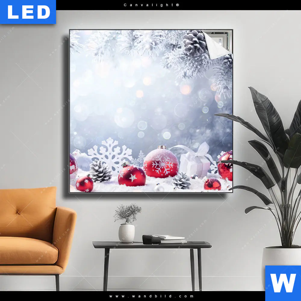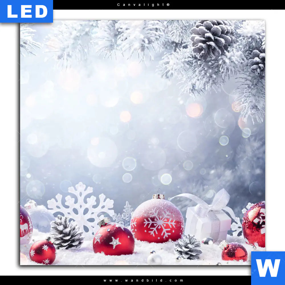 Canvalight® Leuchtbild | Weihnachtskugeln im Winterwunderland | Quadrat