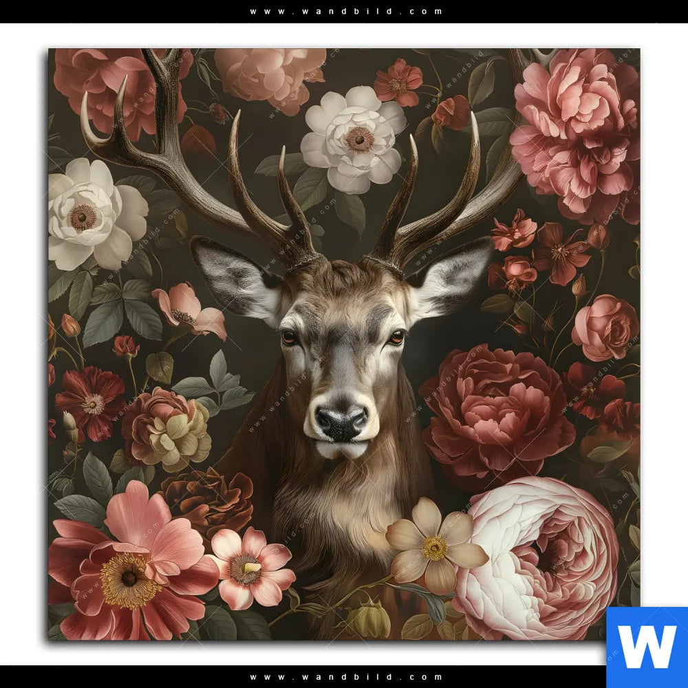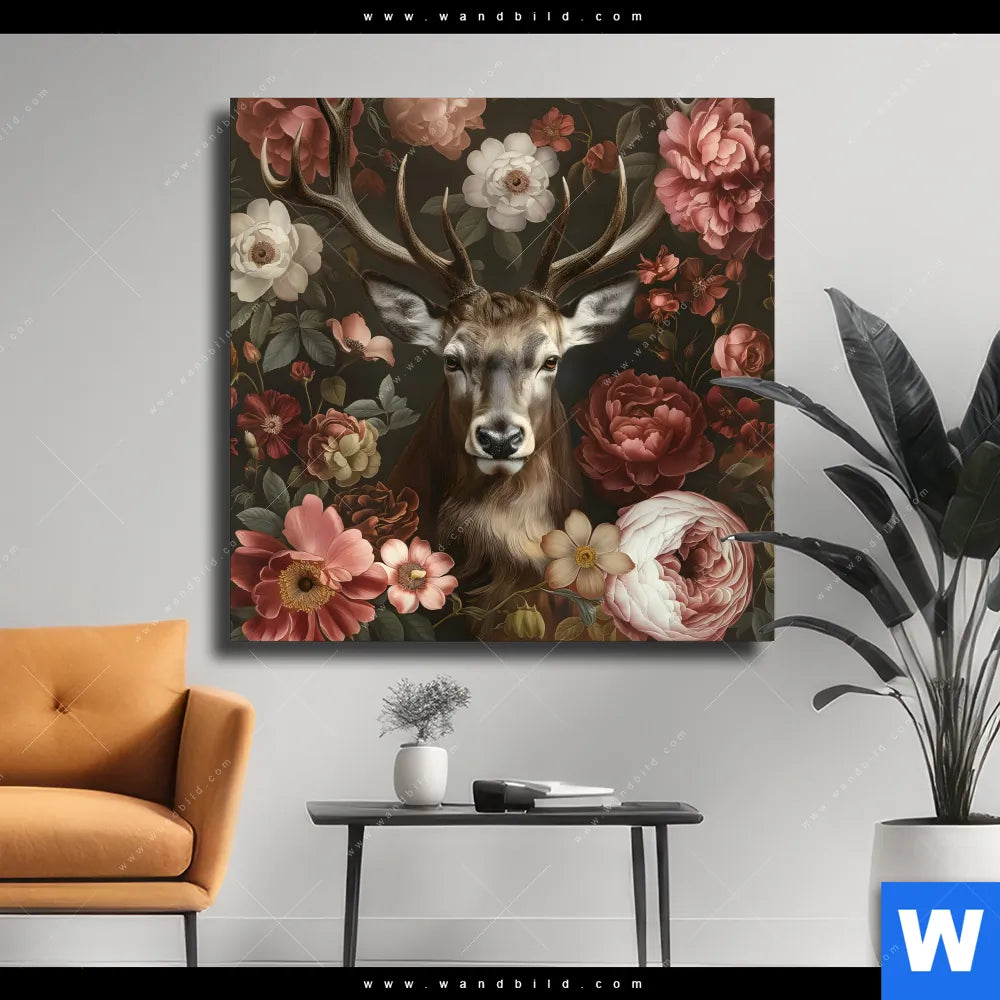 Leinwandbild | Friedlicher Hirsch und Blüten | Quadrat