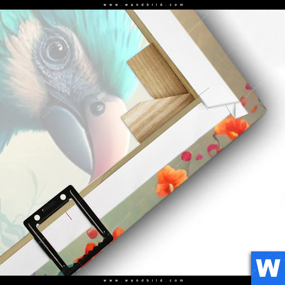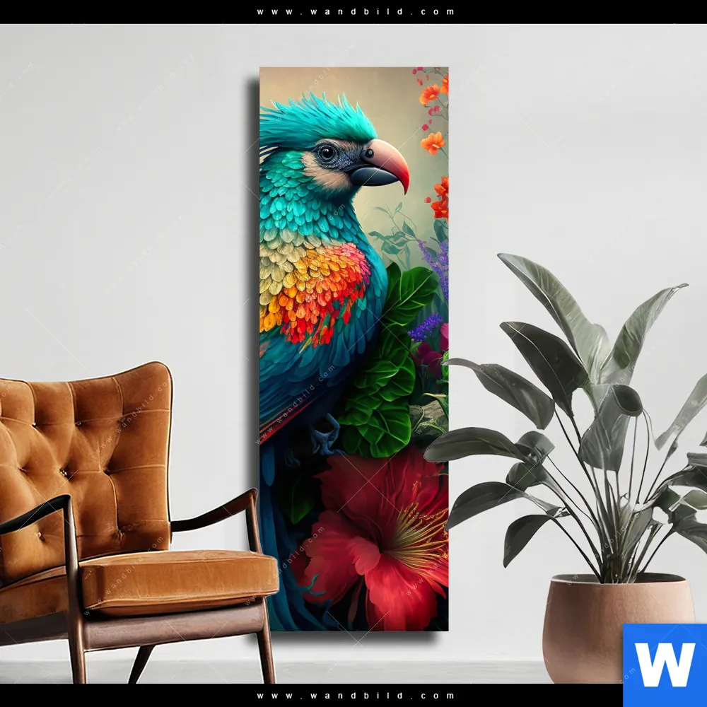 Leinwandbild | Papagei und tropischer Hibiskus | Schmal