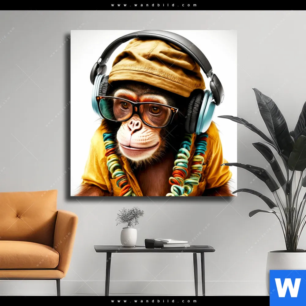 Leinwandbild | Affe mit Kopfhörern & Brille | Quadrat