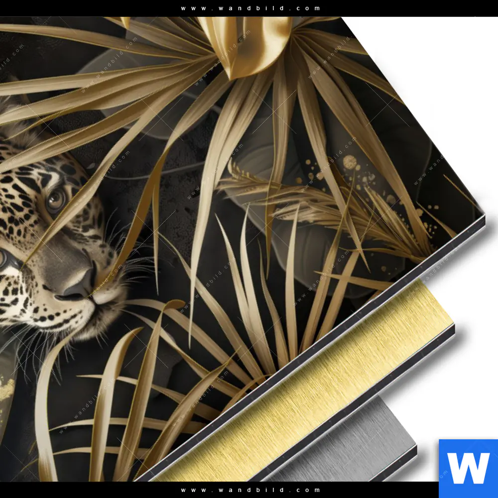 Aluminiumbild gebürstet | Leopard in goldener Tarnung | Querformat