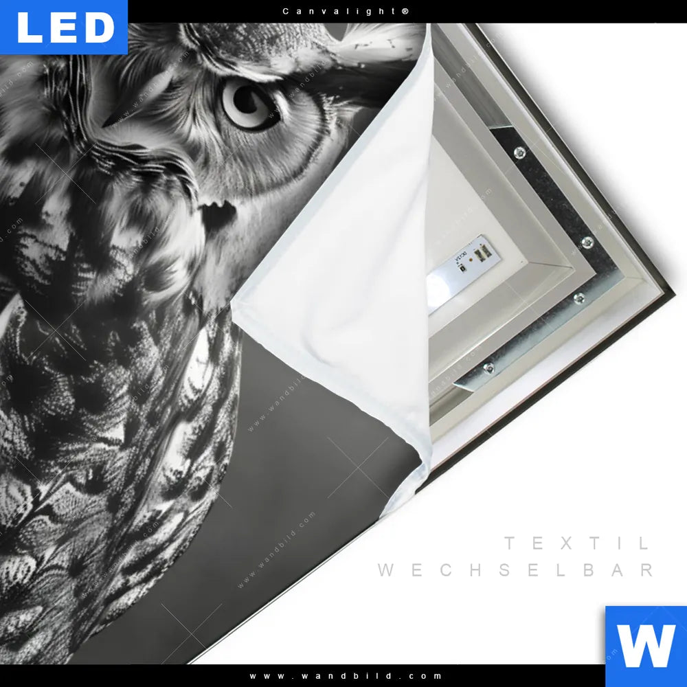 Canvalight® TEX Leuchtbild | Düstere Eleganz der Eule | Hochformat