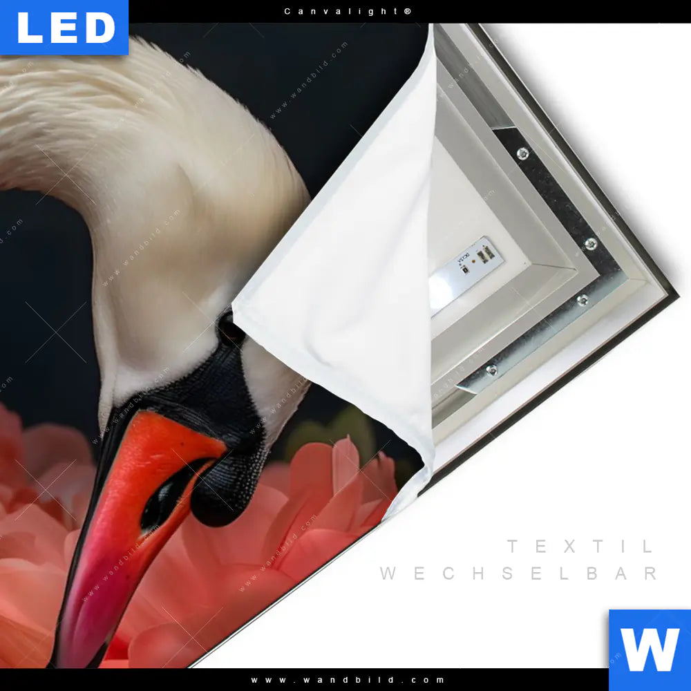 Canvalight® TEX Leuchtbild | Eleganter Schwan mit Blumen | Hochformat