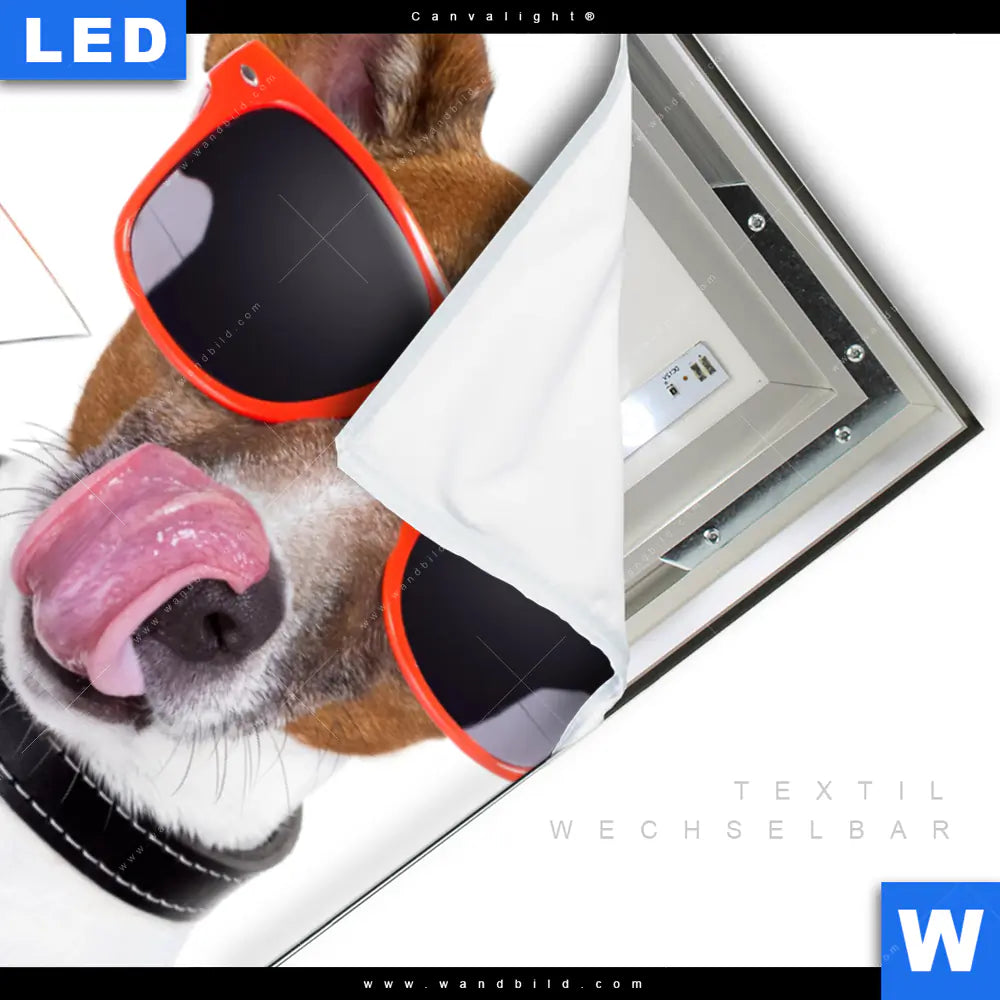 Canvalight® TEX Leuchtbild | Lustiger Hund mit Drink | Hochformat