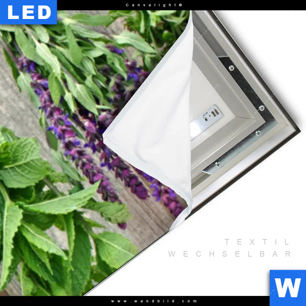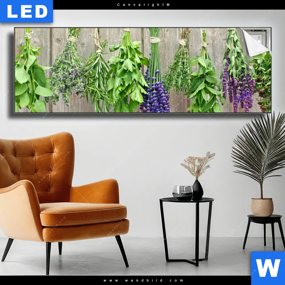 Canvalight® TEX Leuchtbild | Frische Kräuter an Holzstange | Panorama