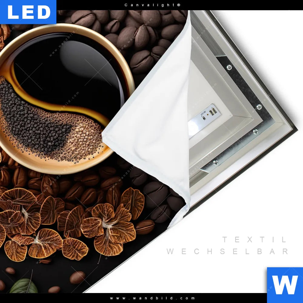 Canvalight® TEX Leuchtbild | Kaffee mit Blattdekoration | Quadrat