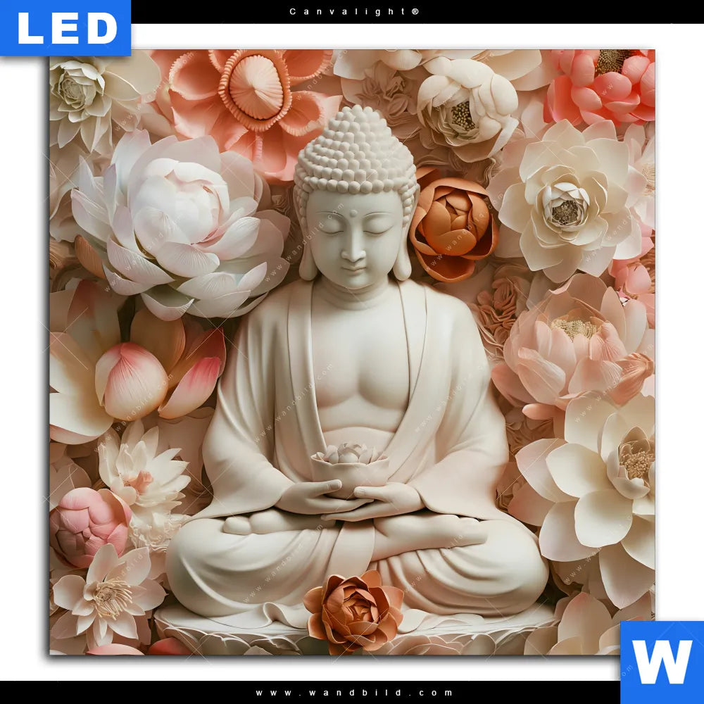 Canvalight® Leuchtbild | Meditierender Buddha mit Blüten | Quadrat