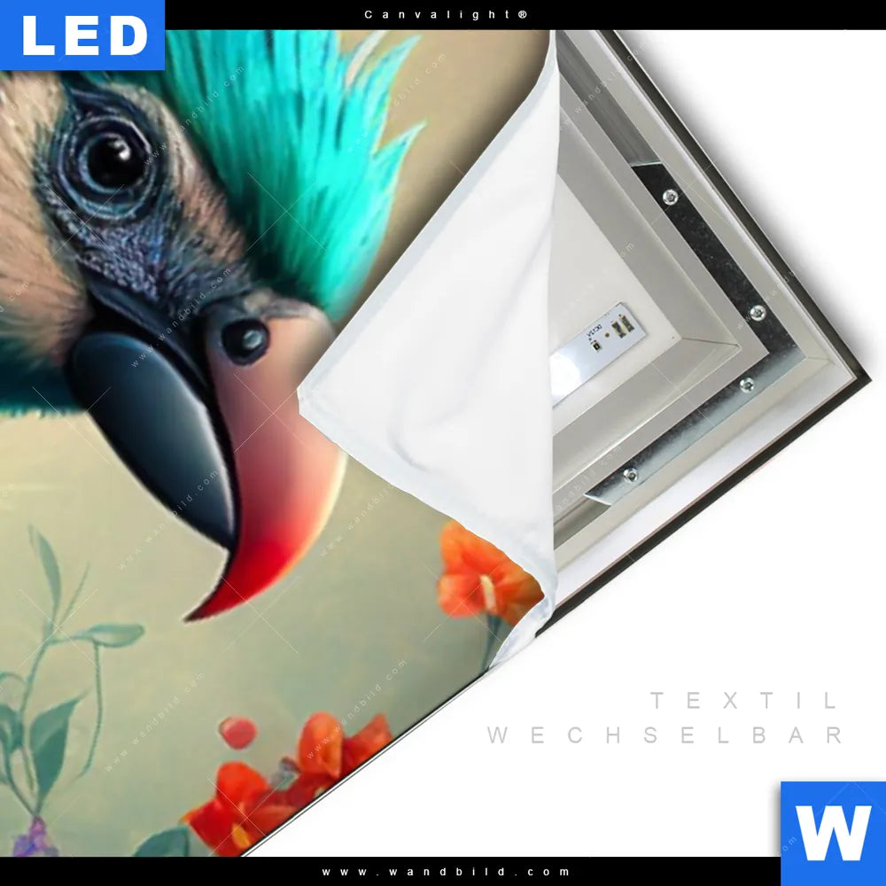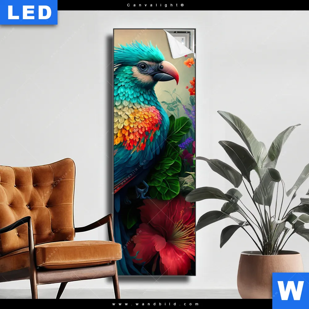 Canvalight® TEX Leuchtbild | Papagei und tropischer Hibiskus | Schmal