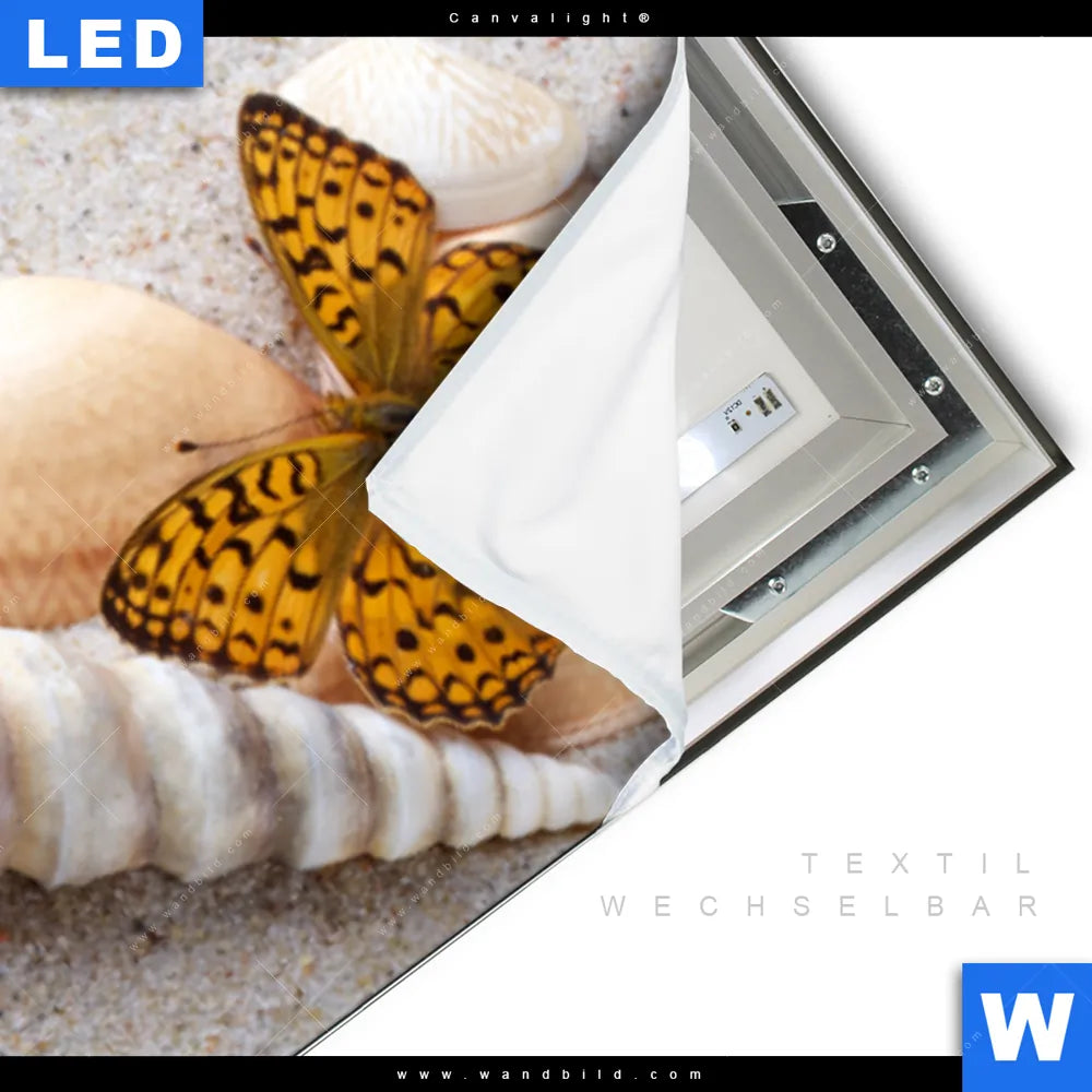 Canvalight® TEX Leuchtbild | Schmetterlinge & Muscheln im Sand | Panorama