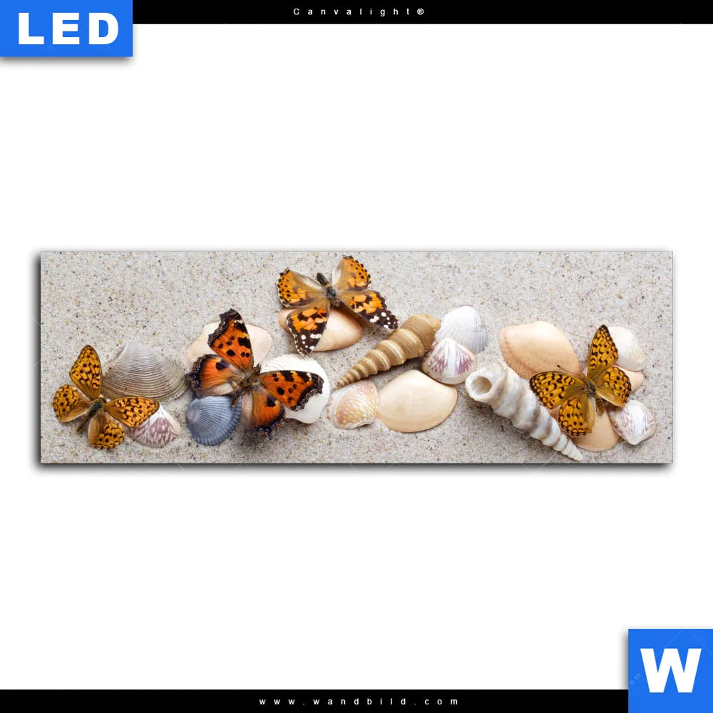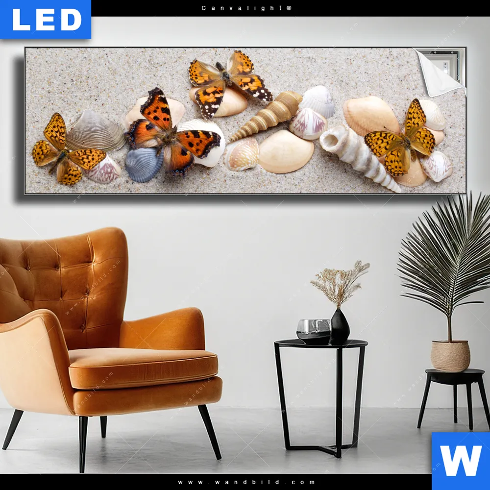 Canvalight® Leuchtbild | Schmetterlinge & Muscheln im Sand | Panorama