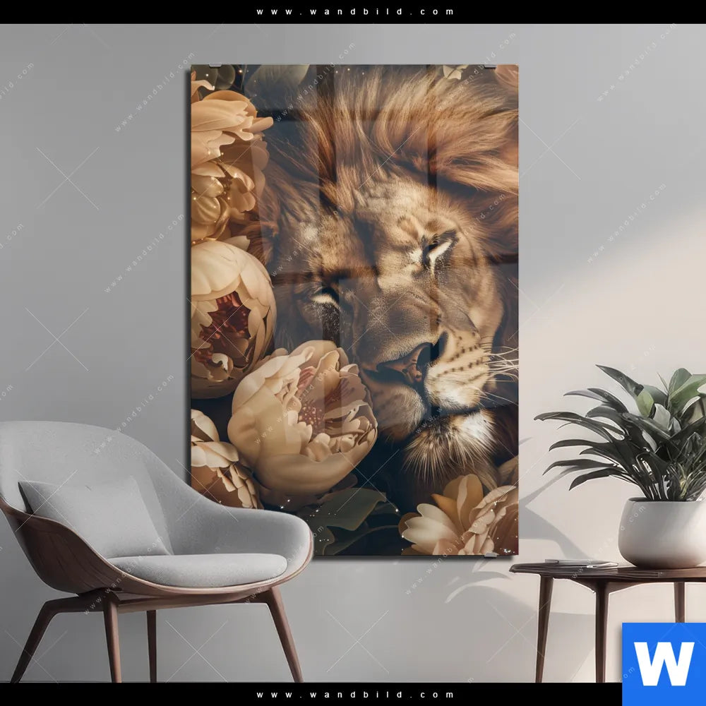 Acrylglasbild | Löwe schläft in Blüten | Hochformat