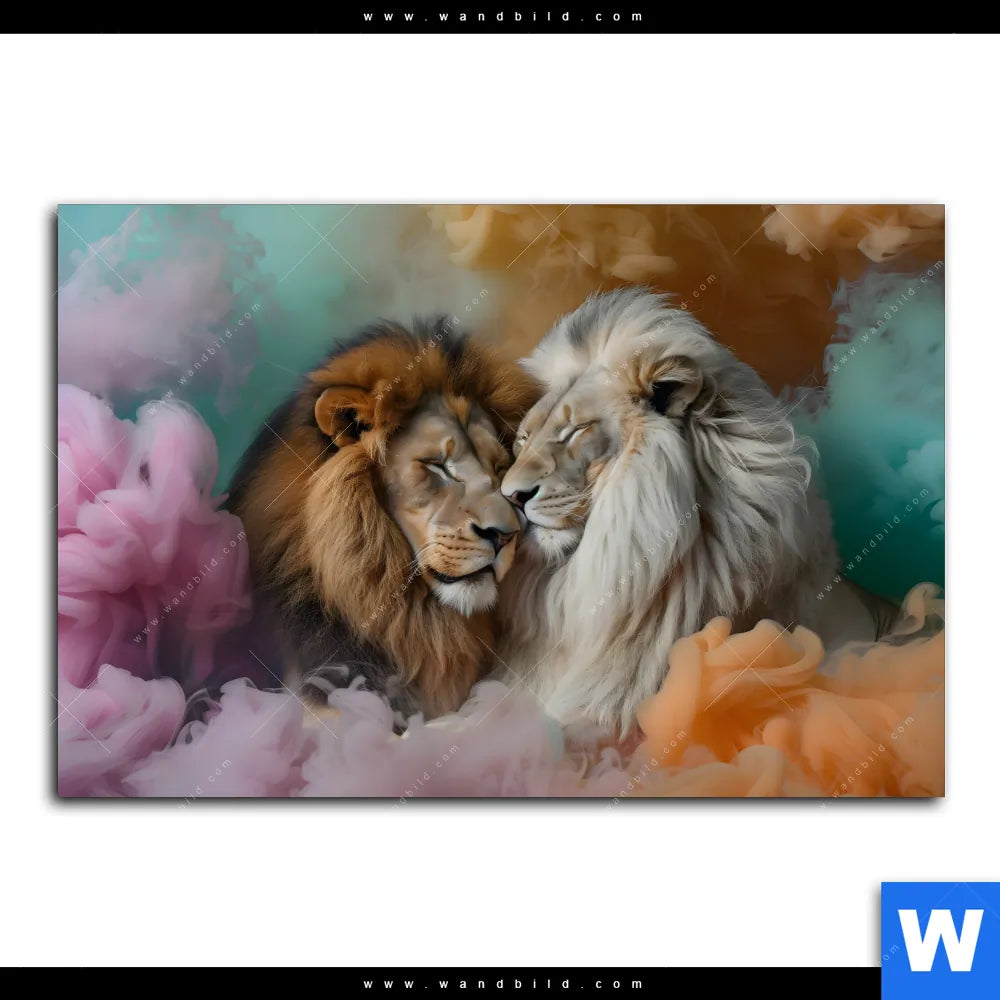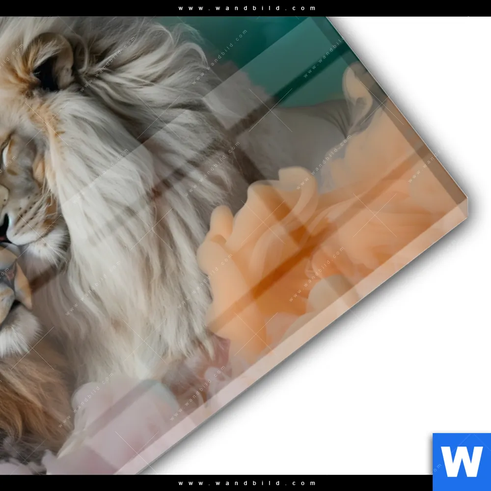 Acrylglasbild | Sanfte Löwenmomente in buntem Nebel | Querformat