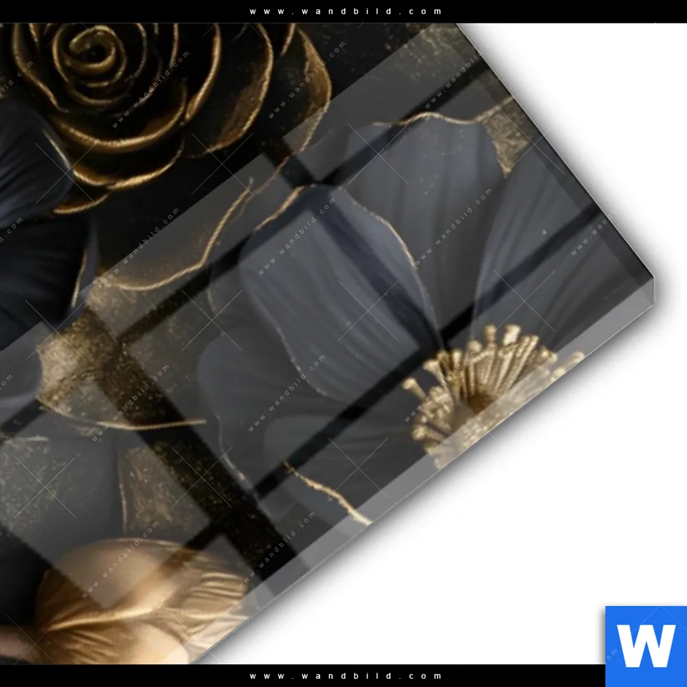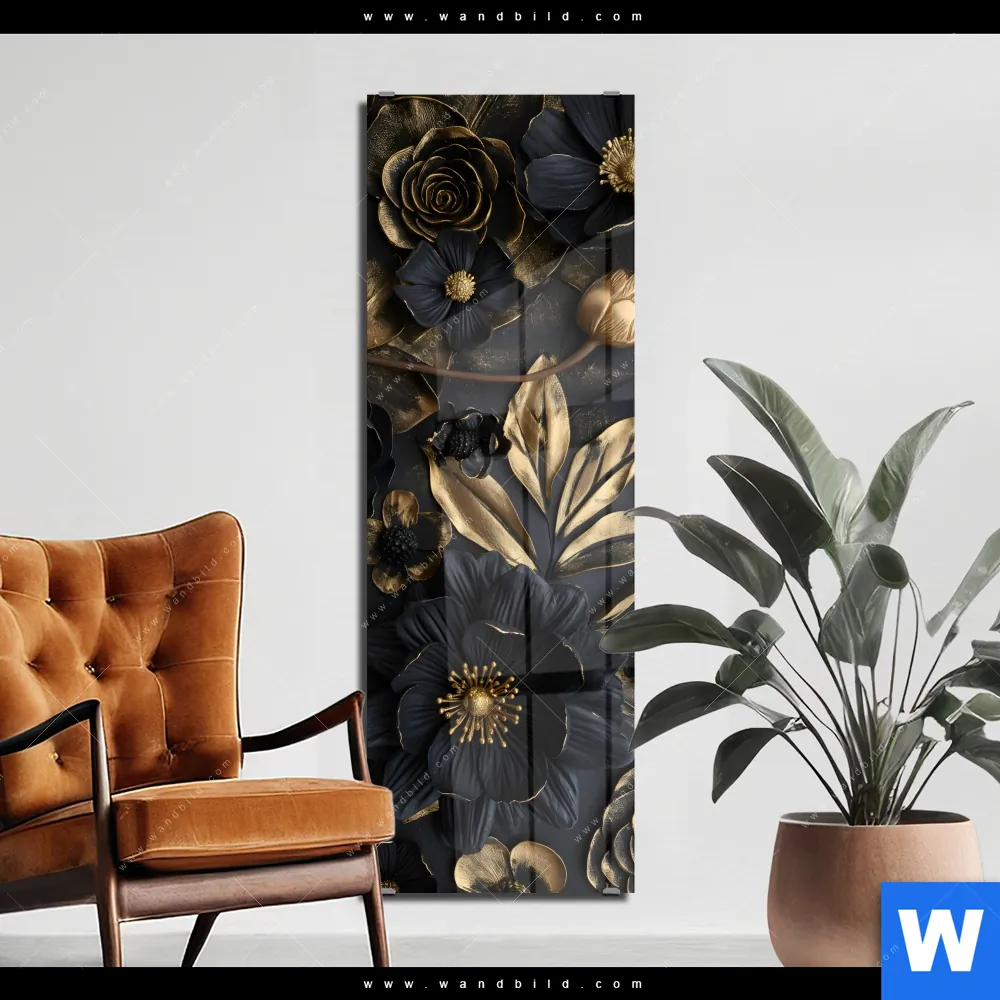 Acrylglasbild | Schwarze und goldene Blüten | Schmal