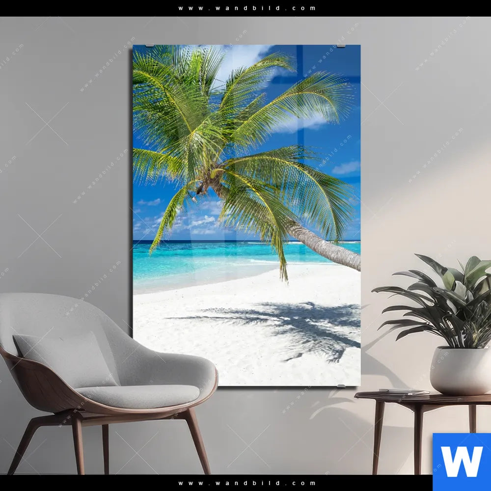 Acrylglasbild | Weißer Strand & Kokospalme | Hochformat