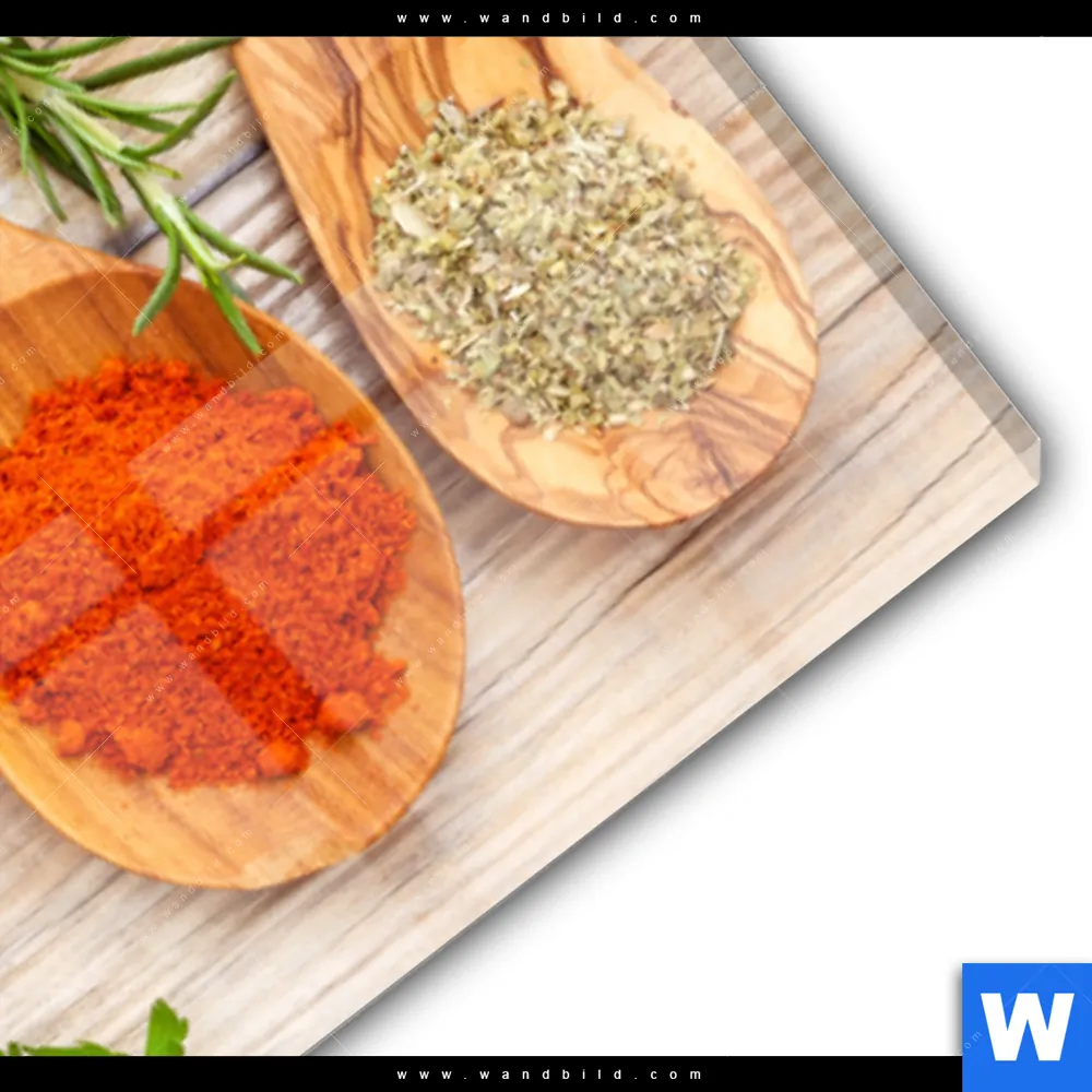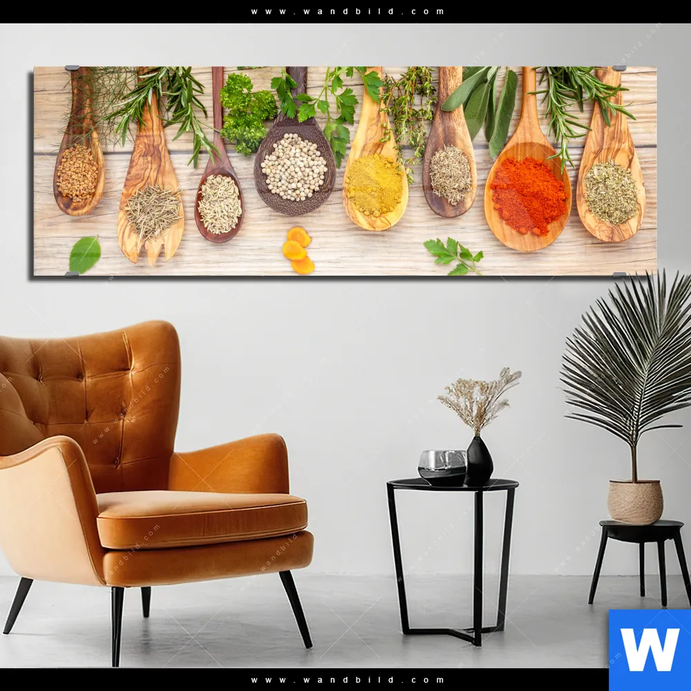 Acrylglasbild | Gewürze auf hölzernen Löffeln | Panorama