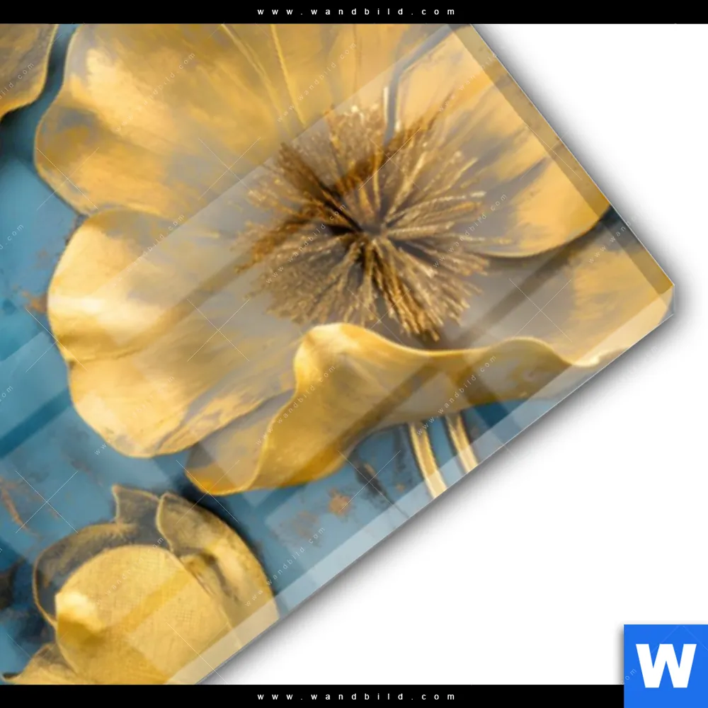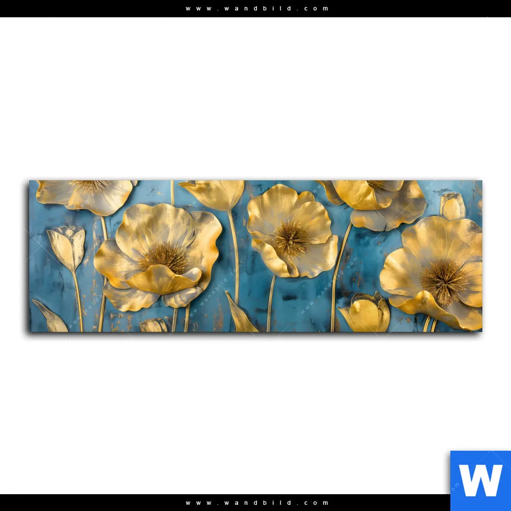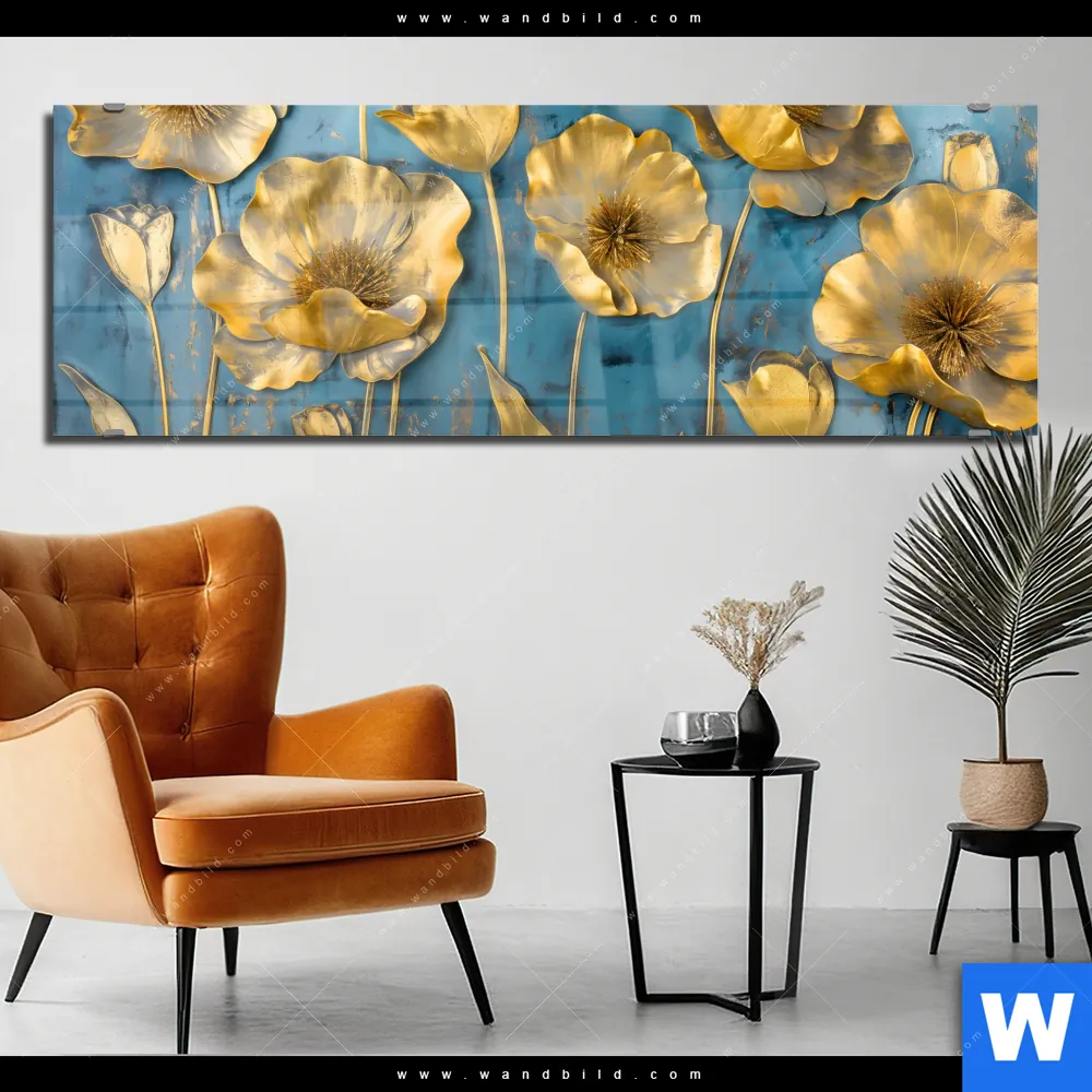 Acrylglasbild | Goldene Blumen auf Blau | Panorama