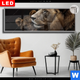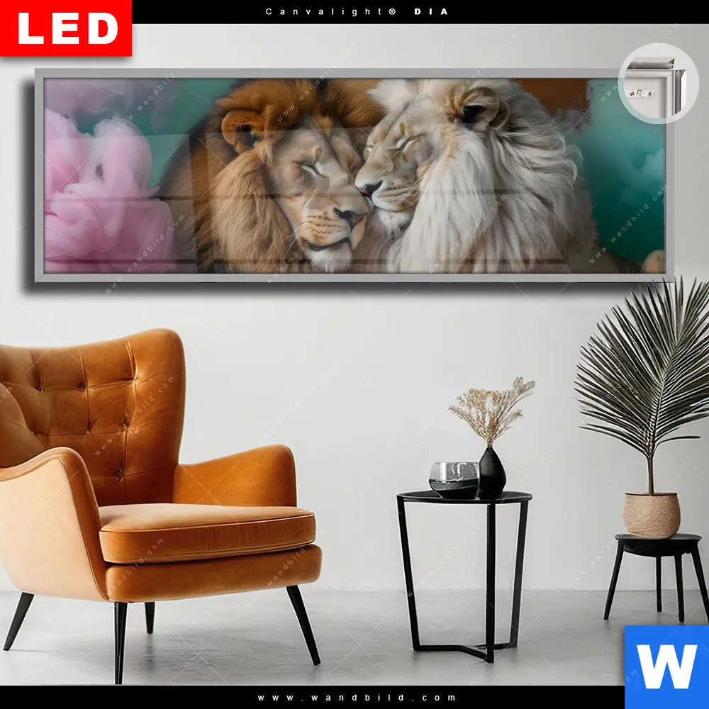 Canvalight® DIA Leuchtbild | Sanfte Löwenmomente in buntem Nebel | Panorama