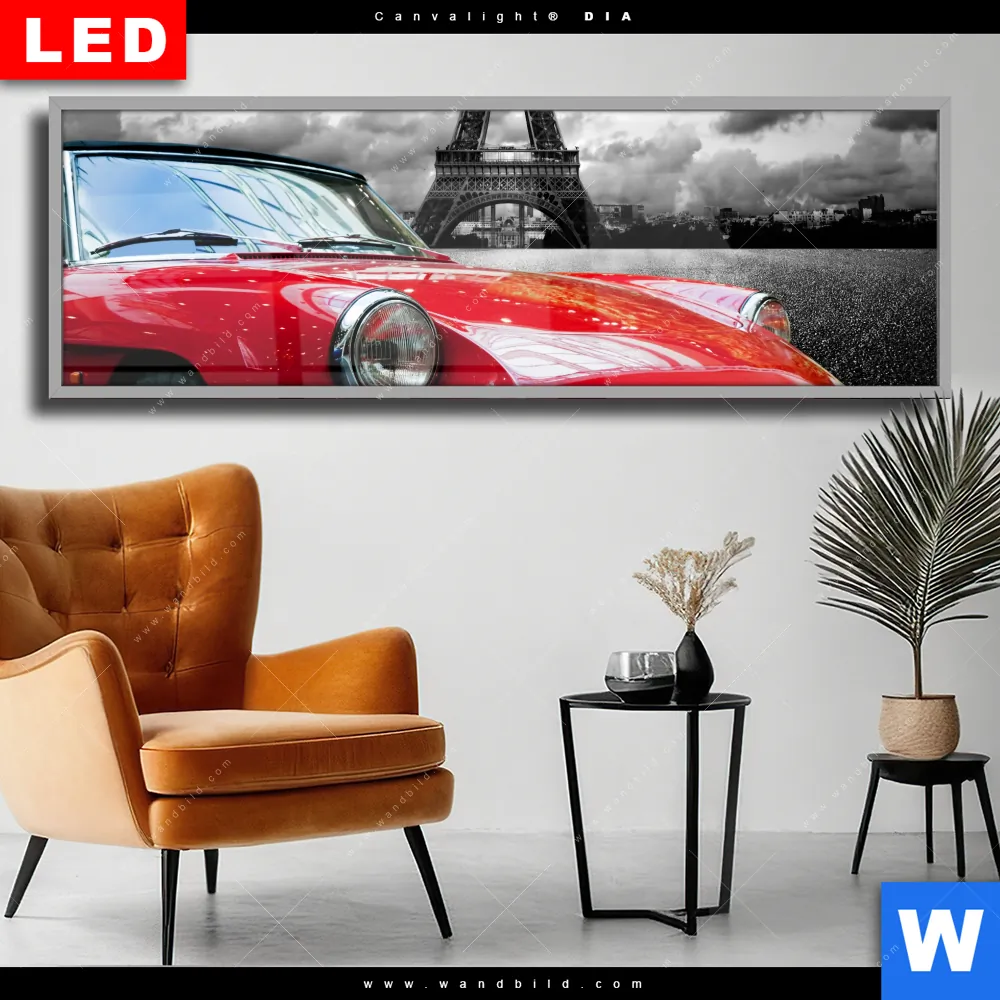 Wechselmotiv Acrylglas Canvalight® DIA | Eiffelturm & Rotes Auto | Panorama