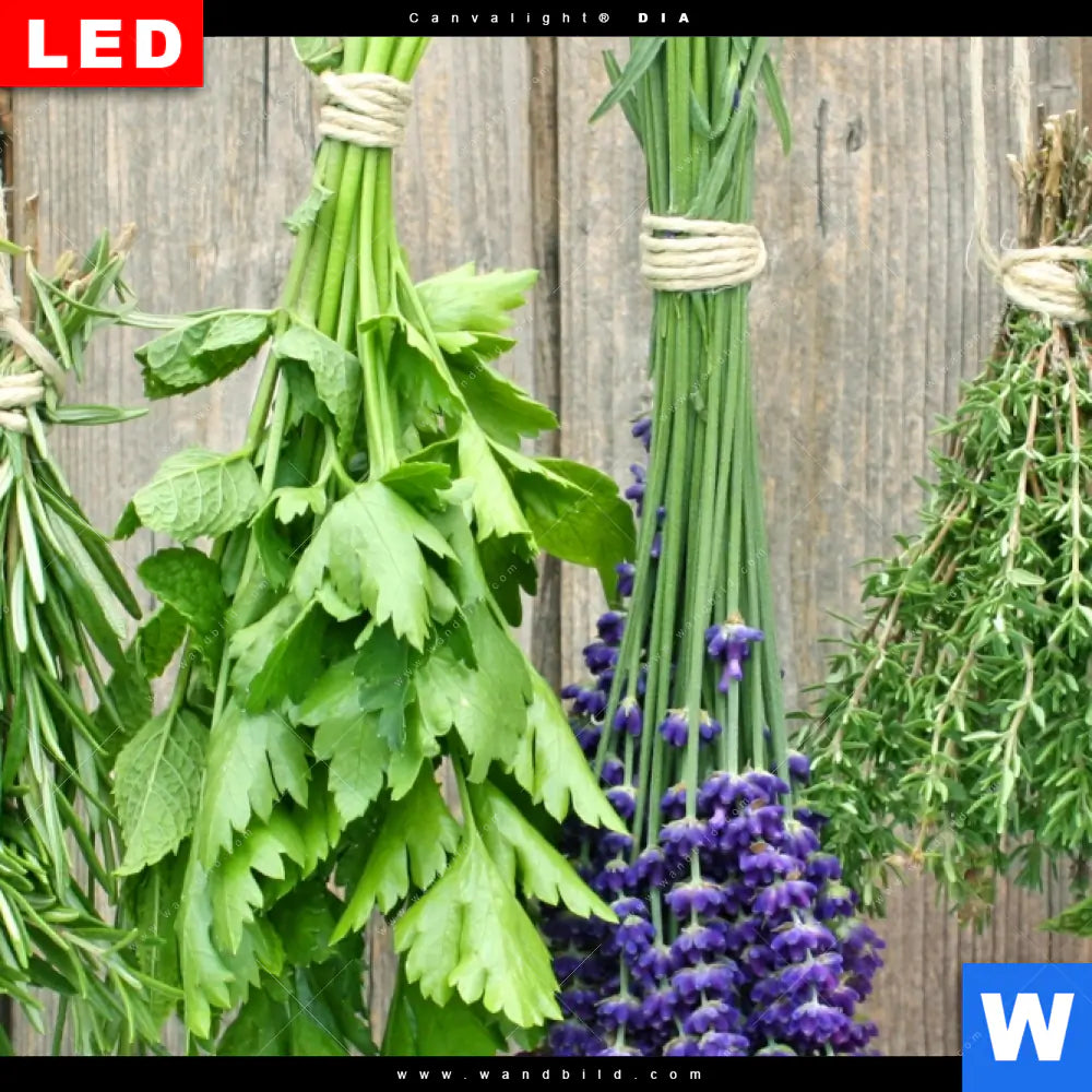 Wechselmotiv Acrylglas Canvalight® DIA | Frische Kräuter an Holzstange | Panorama
