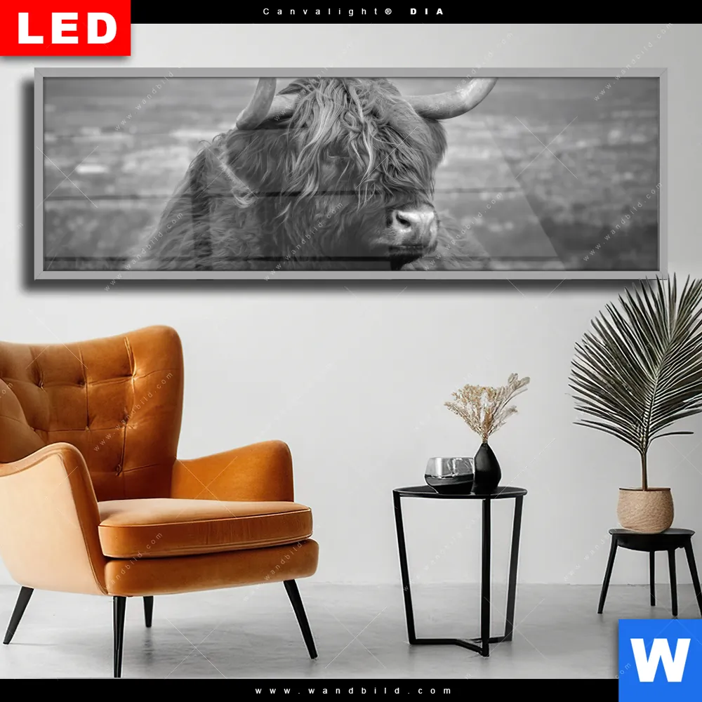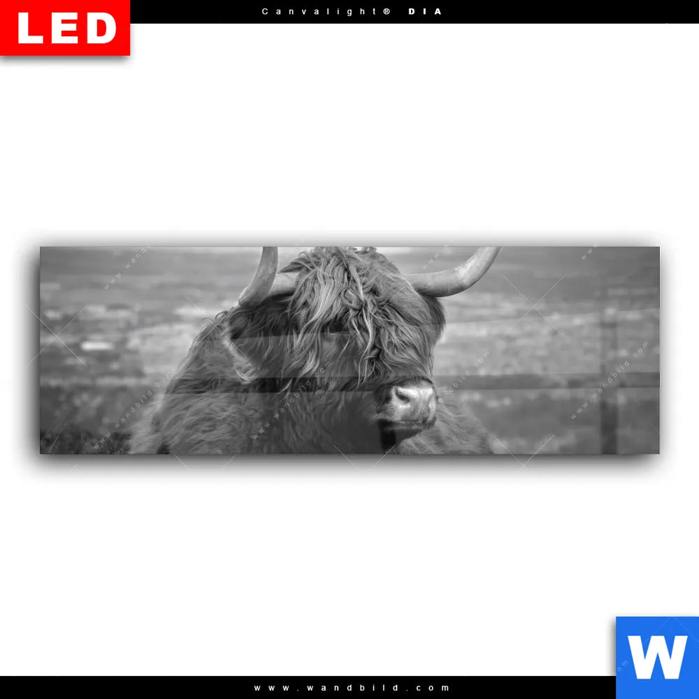 Wechselmotiv Acrylglas Canvalight® DIA | Hochland-Rind Schwarz-Weiß No. 2 | Panorama