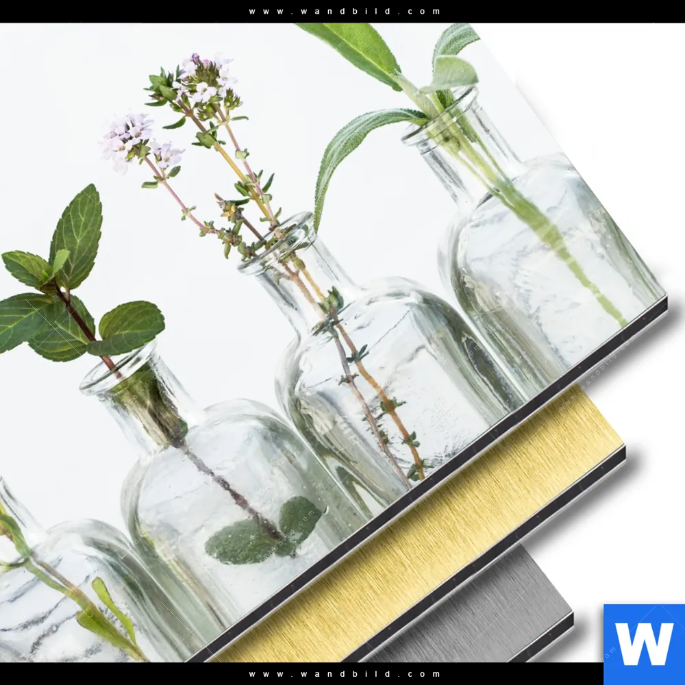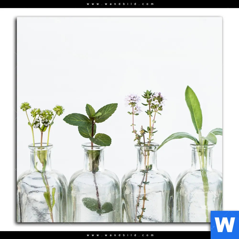 Aluminiumbild gebürstet | Kräuter in Flaschen | Quadrat