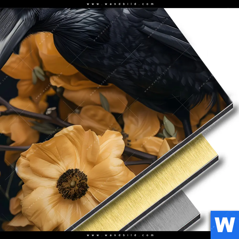 Aluminiumbild gebürstet | Naturbild - Rabe & Blüten | Quadrat