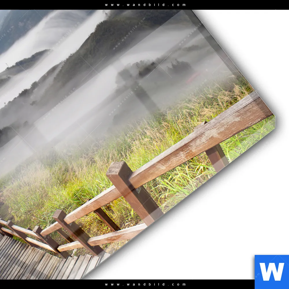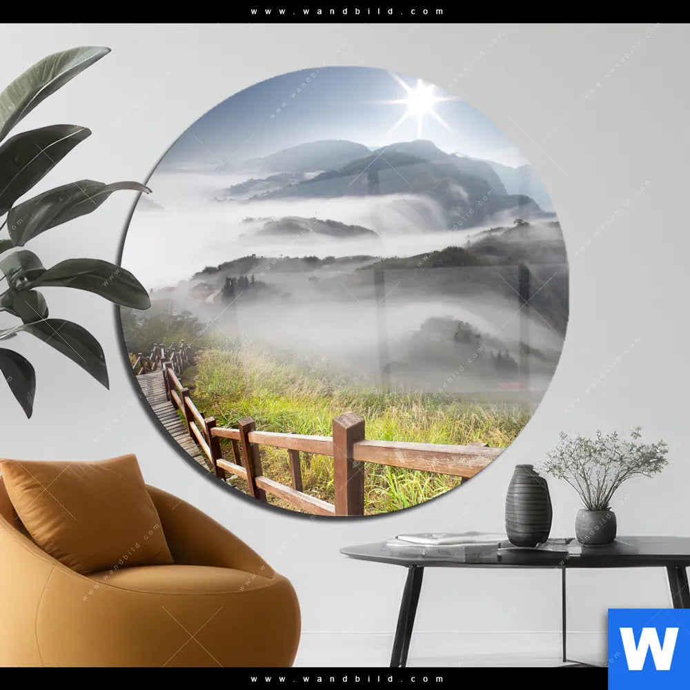 Acrylglasbild | Holztreppe auf Berg mit Wolken | Rund