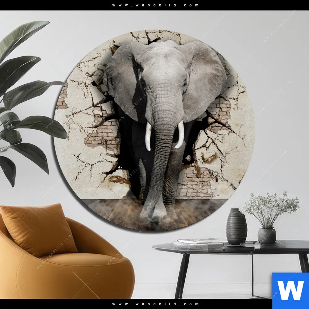 Alu-Dibond Bild | Elefant bricht durch Mauer | Rund