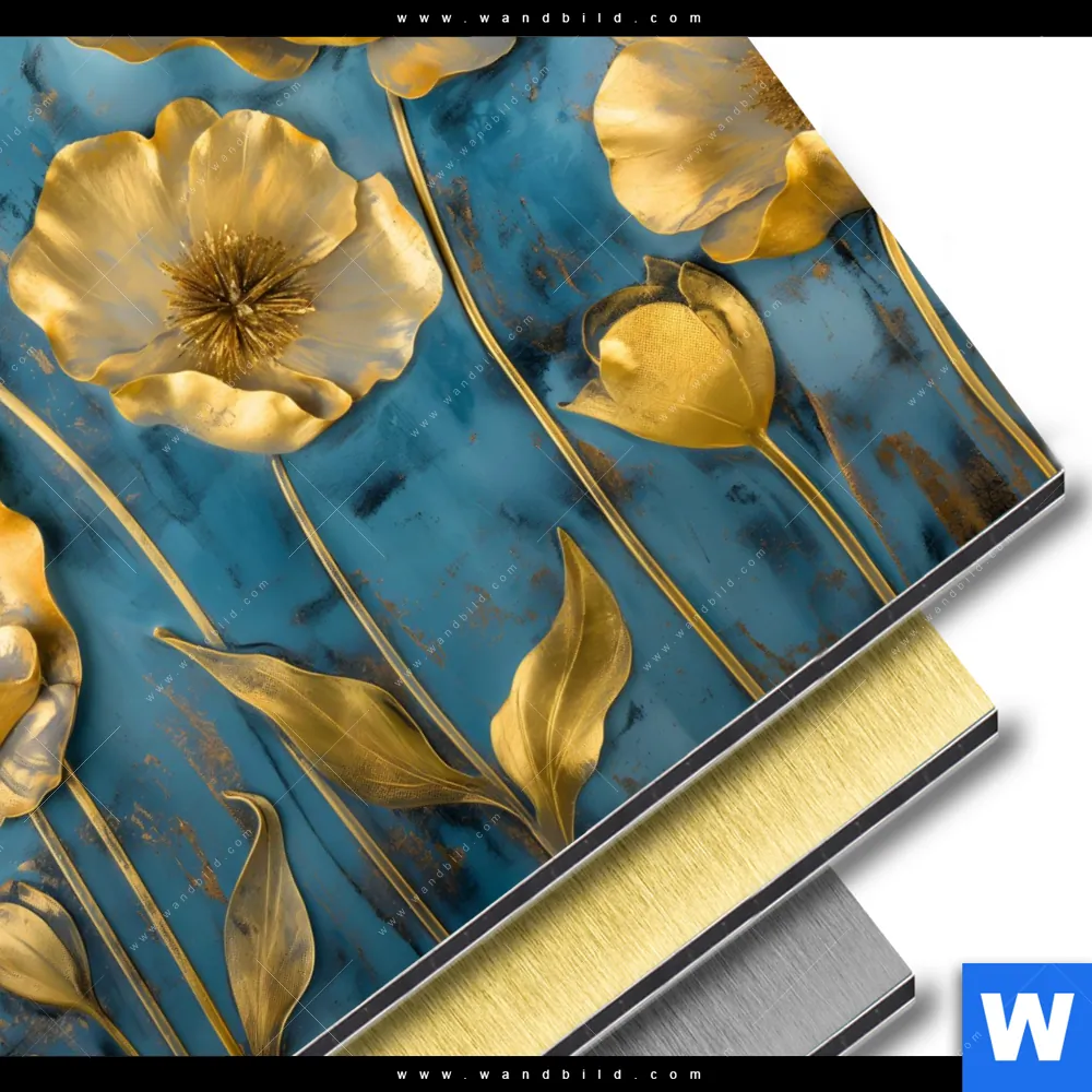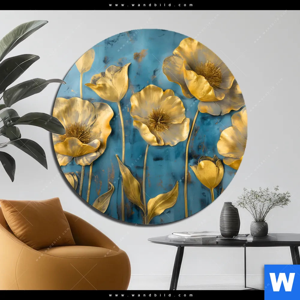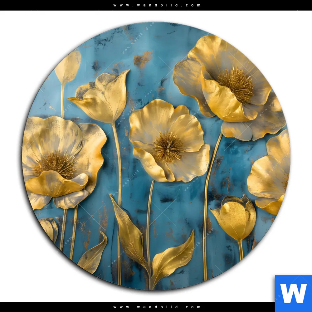 Alu-Dibond Bild | Goldene Blumen auf Blau | Rund