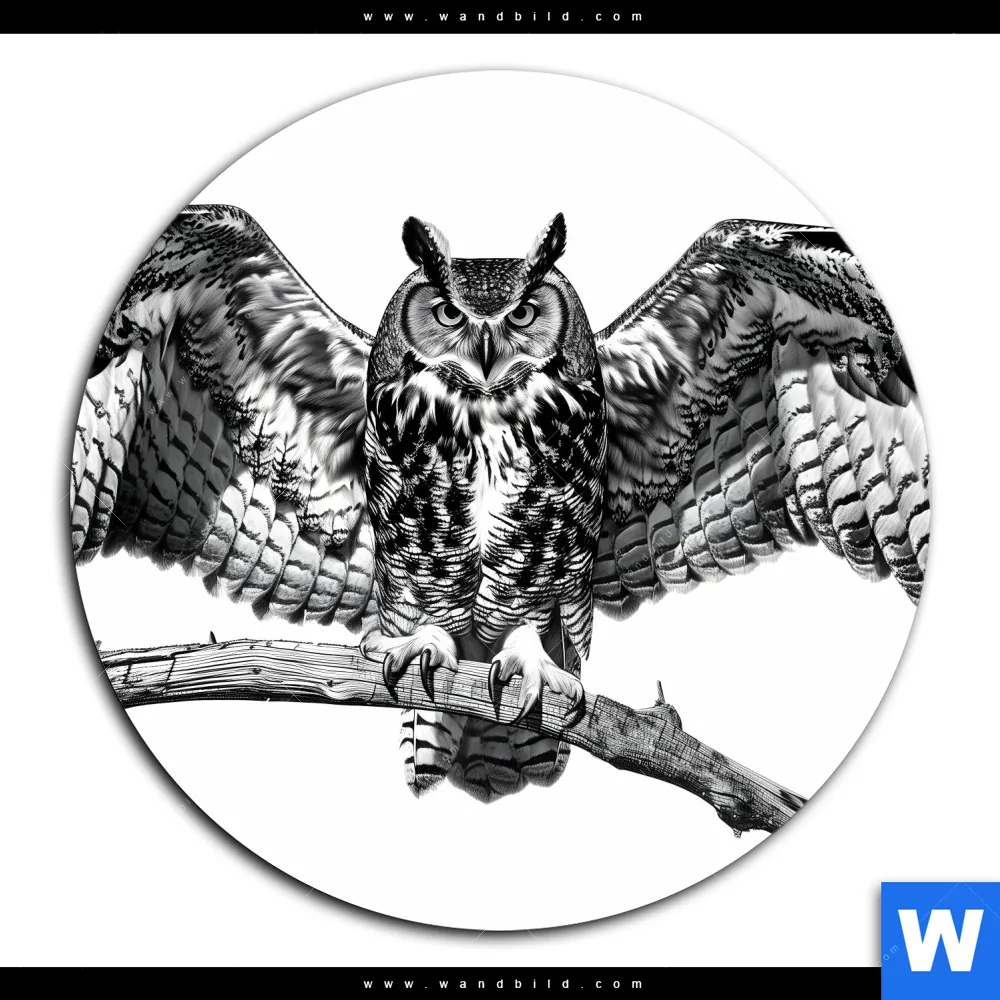 Aluminiumbild gebürstet | Eule auf Ast | Rund