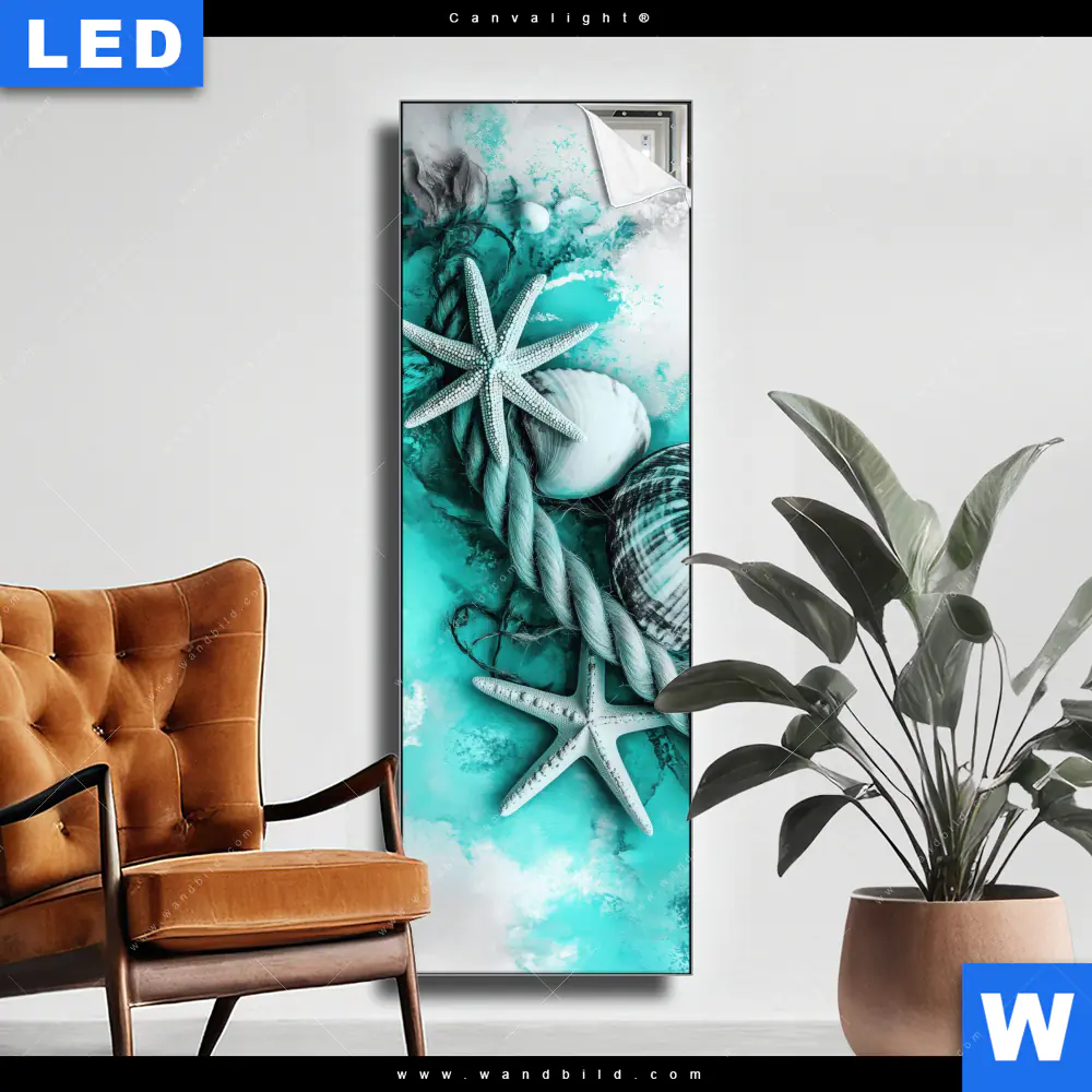Canvalight® TEX Leuchtbild | Muscheln-Meereszauber in Türkis | Schmal