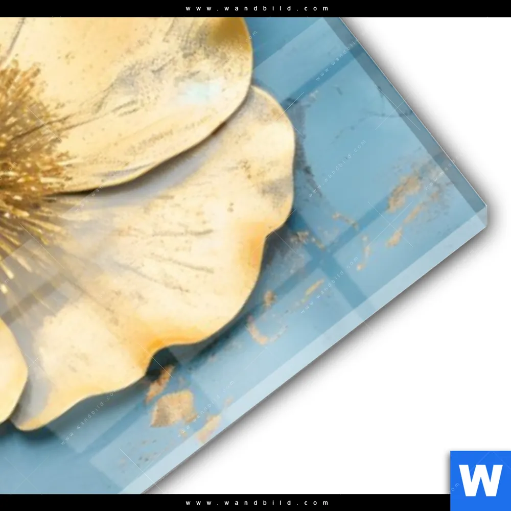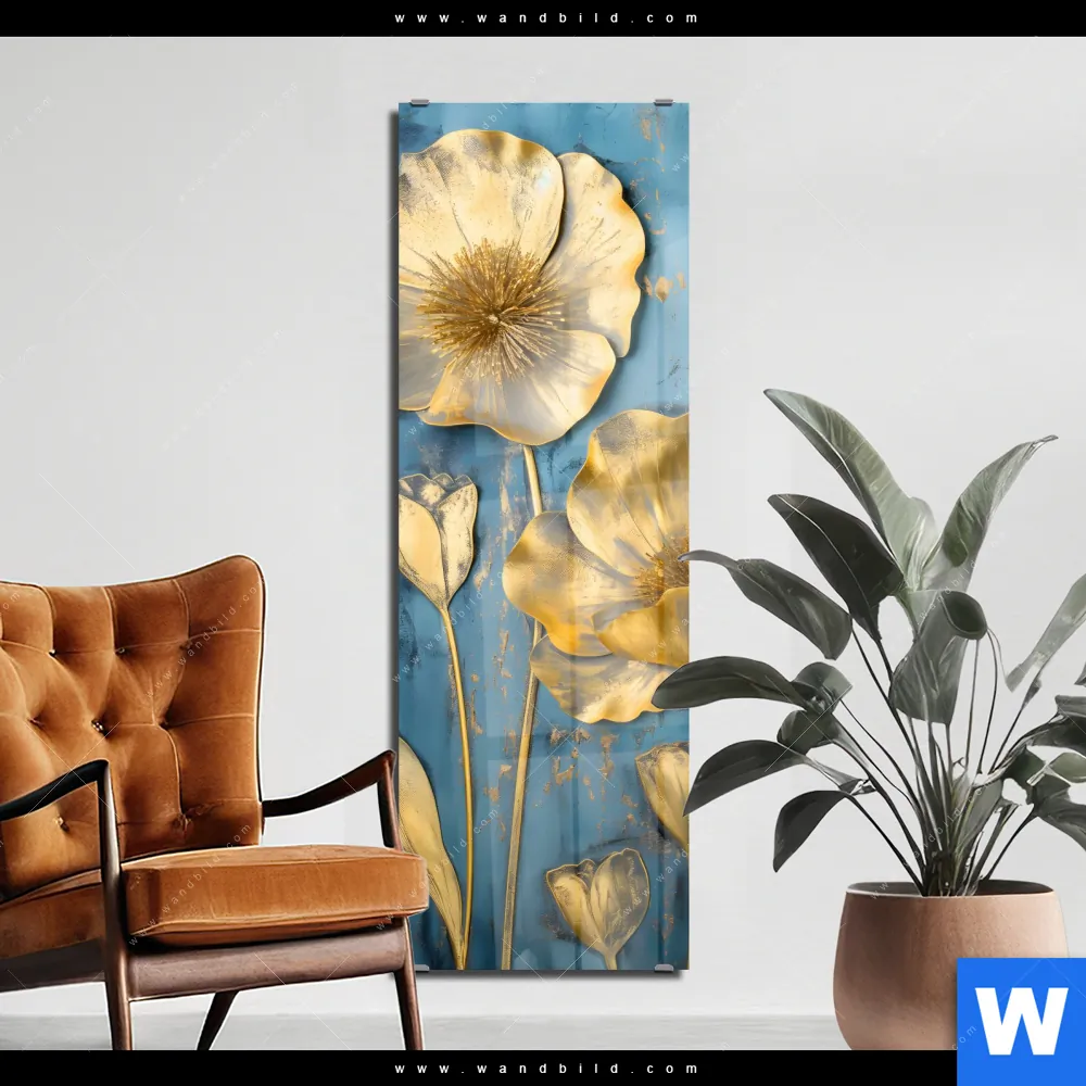 Acrylglasbild | Goldene Blumen auf Blau | Schmal