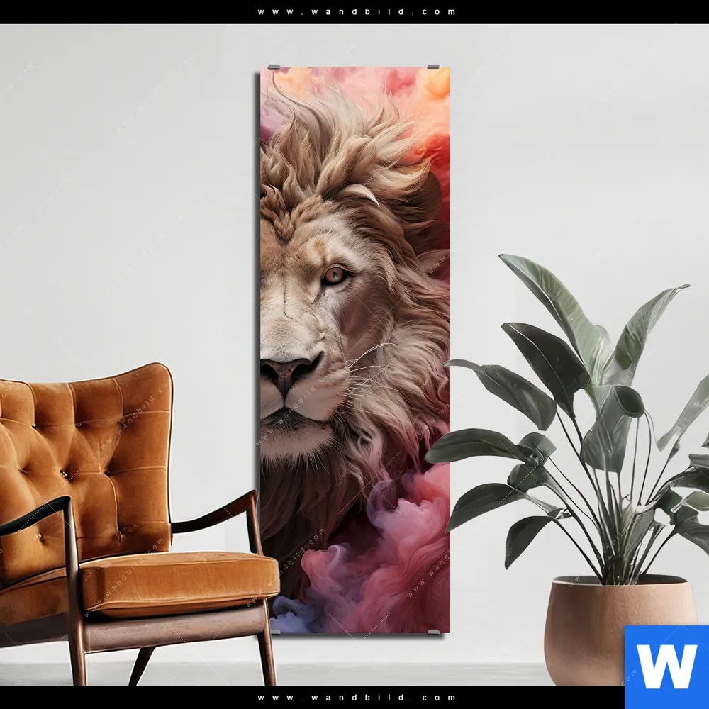 Alu-Dibond Bild | Löwengesicht in buntem Rauch | Schmal