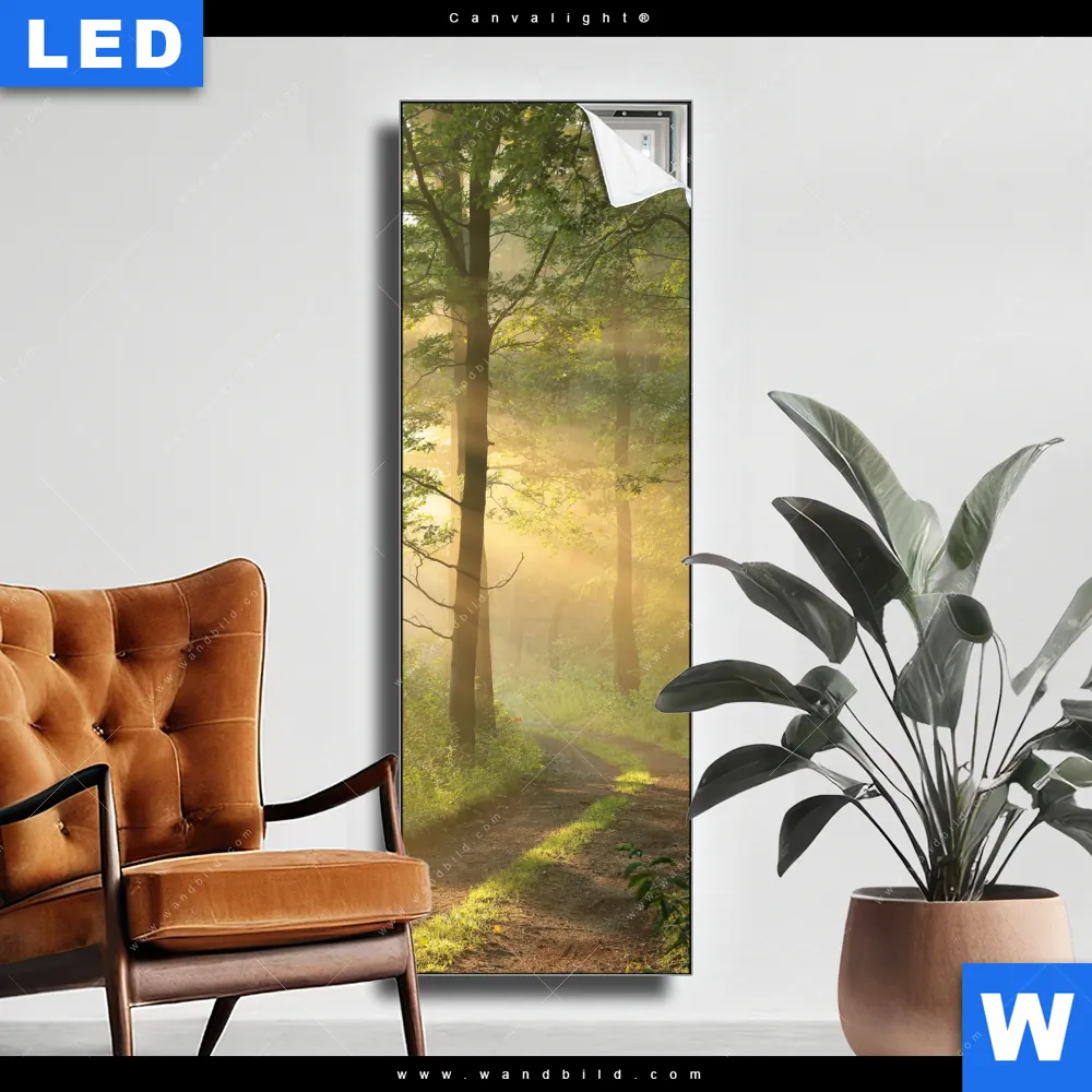 Canvalight® TEX Leuchtbild | Morgenspaziergang im nebeligem Wald | Schmal