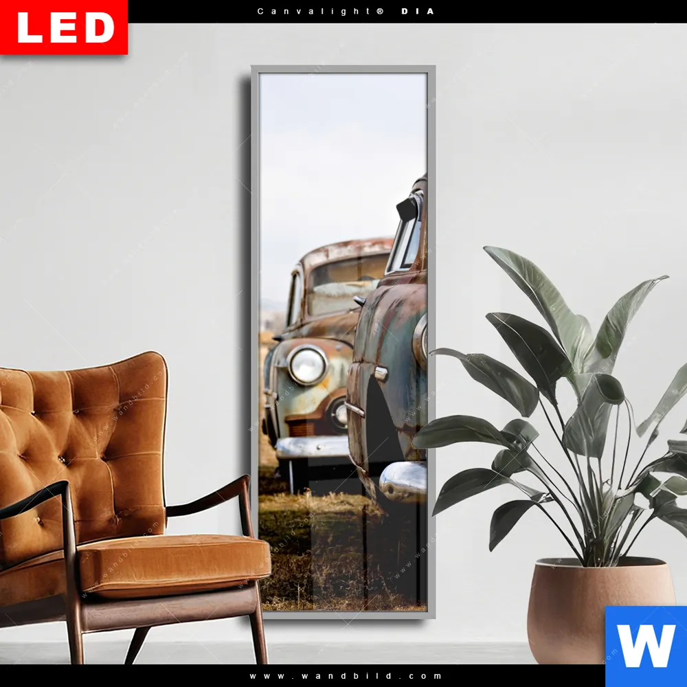 Wechselmotiv Acrylglas Canvalight® DIA | Alte rostige Autos | Schmal