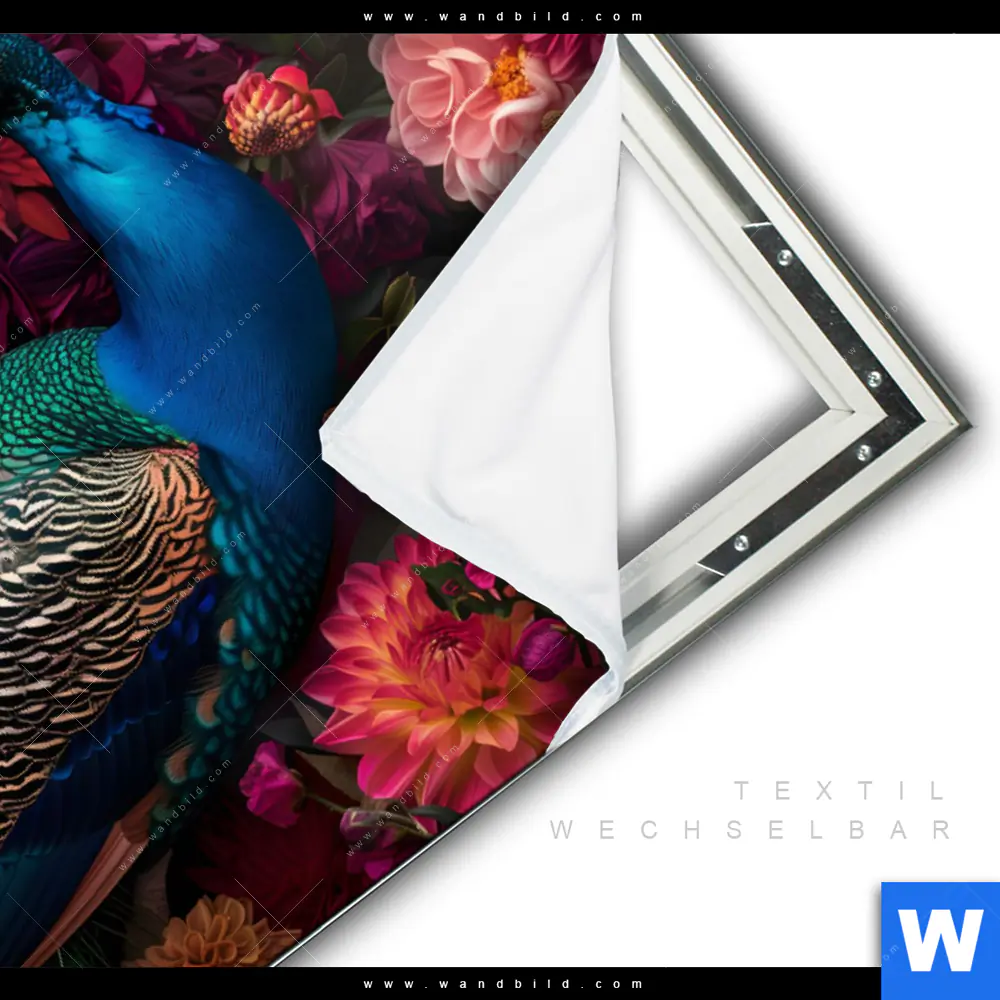 Spannbild | Prachtvoller Pfau und Blüten | Querformat