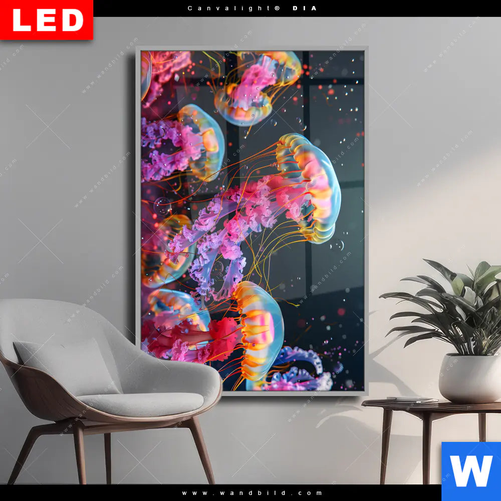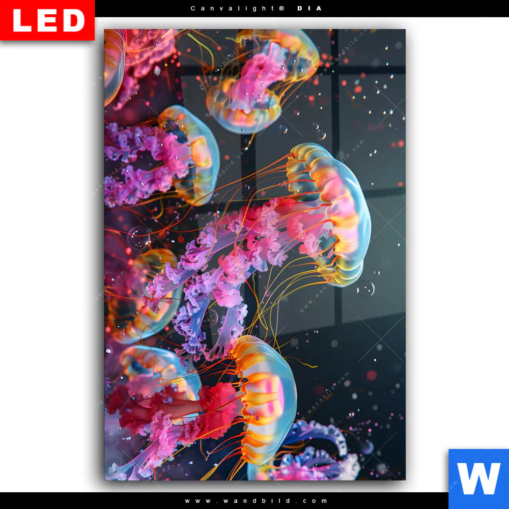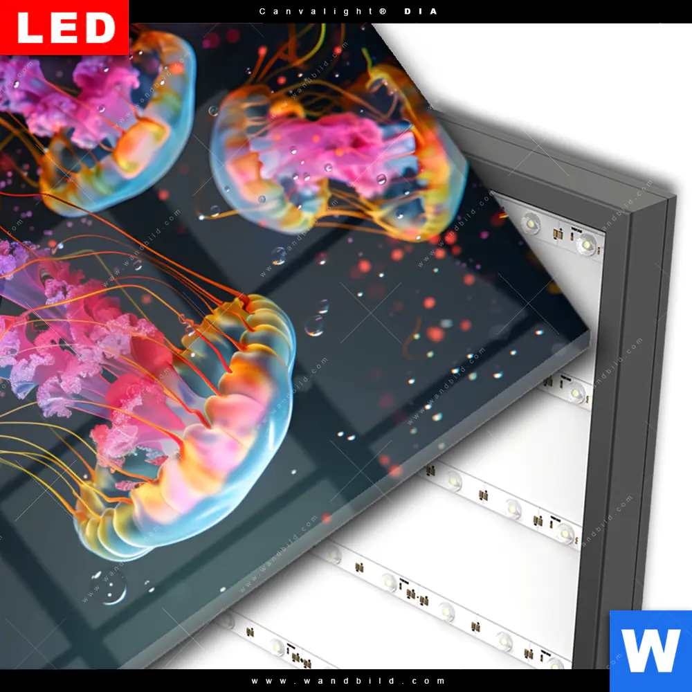 Wechselmotiv Acrylglas Canvalight® DIA | Leuchtende Quallen unter Wasser | Hochformat