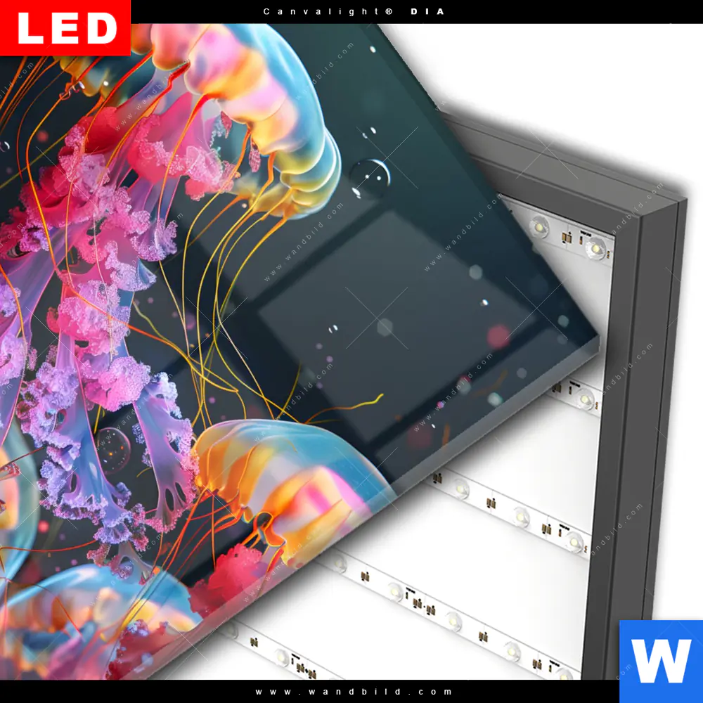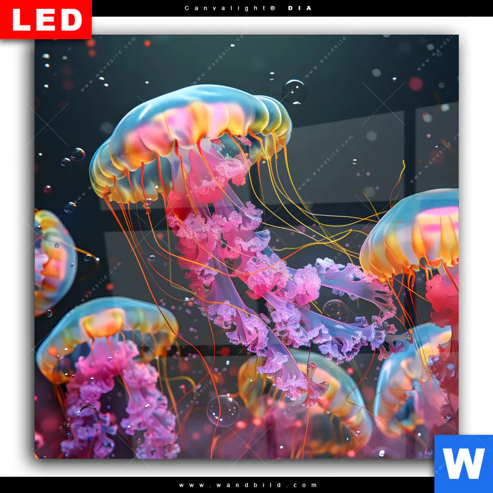 Wechselmotiv Acrylglas Canvalight® DIA | Leuchtende Quallen unter Wasser | Quadrat