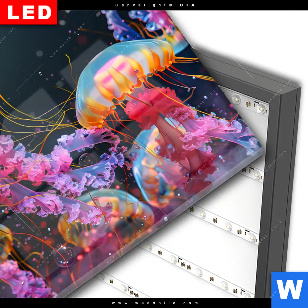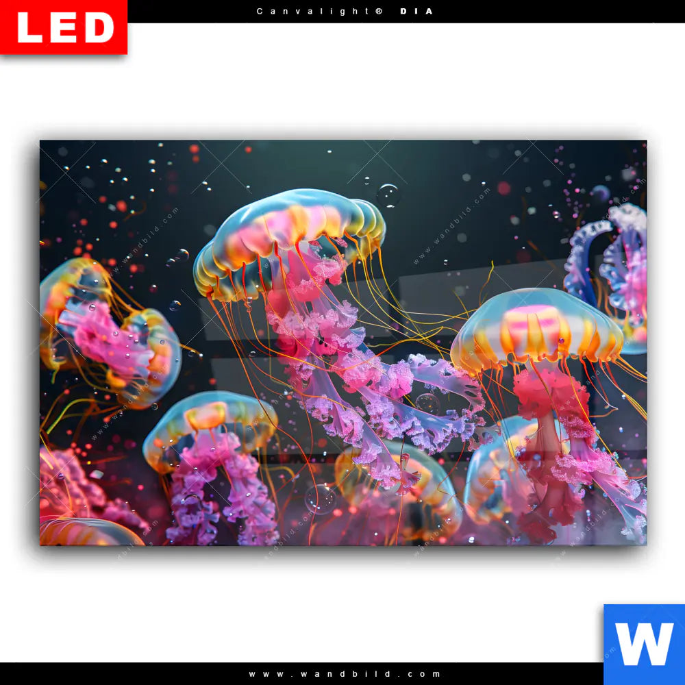 Wechselmotiv Acrylglas Canvalight® DIA | Leuchtende Quallen unter Wasser | Querformat