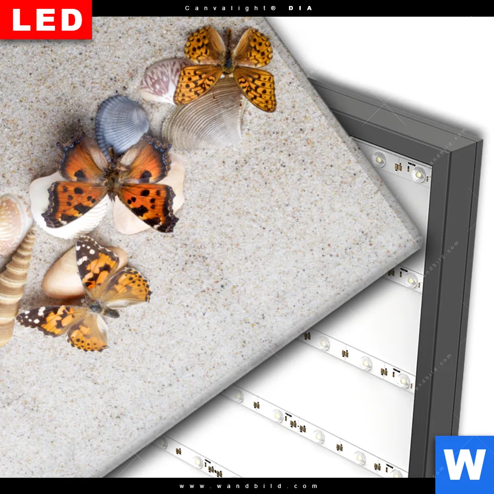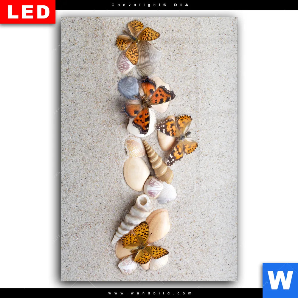 Wechselmotiv Acrylglas Canvalight® DIA | Schmetterlinge & Muscheln im Sand | Hochformat