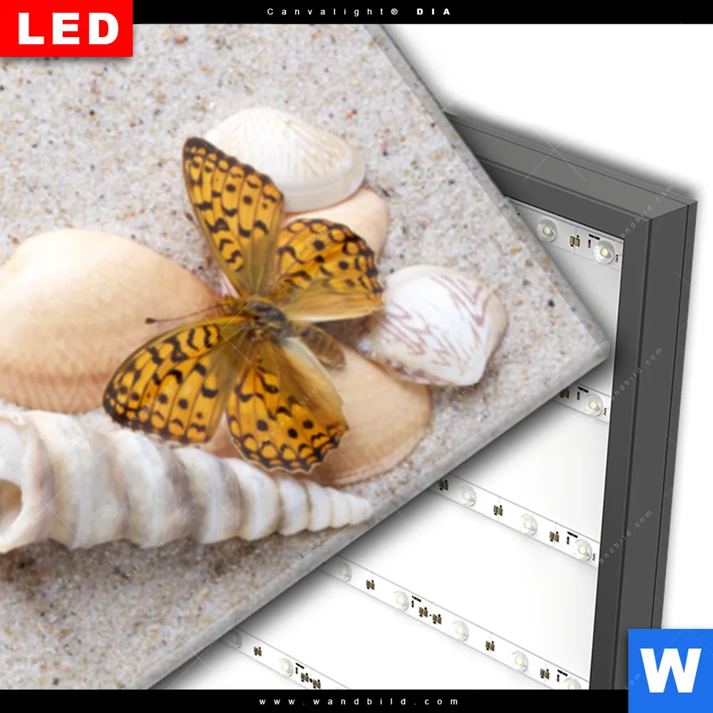 Wechselmotiv Acrylglas Canvalight® DIA | Schmetterlinge & Muscheln im Sand | Panorama