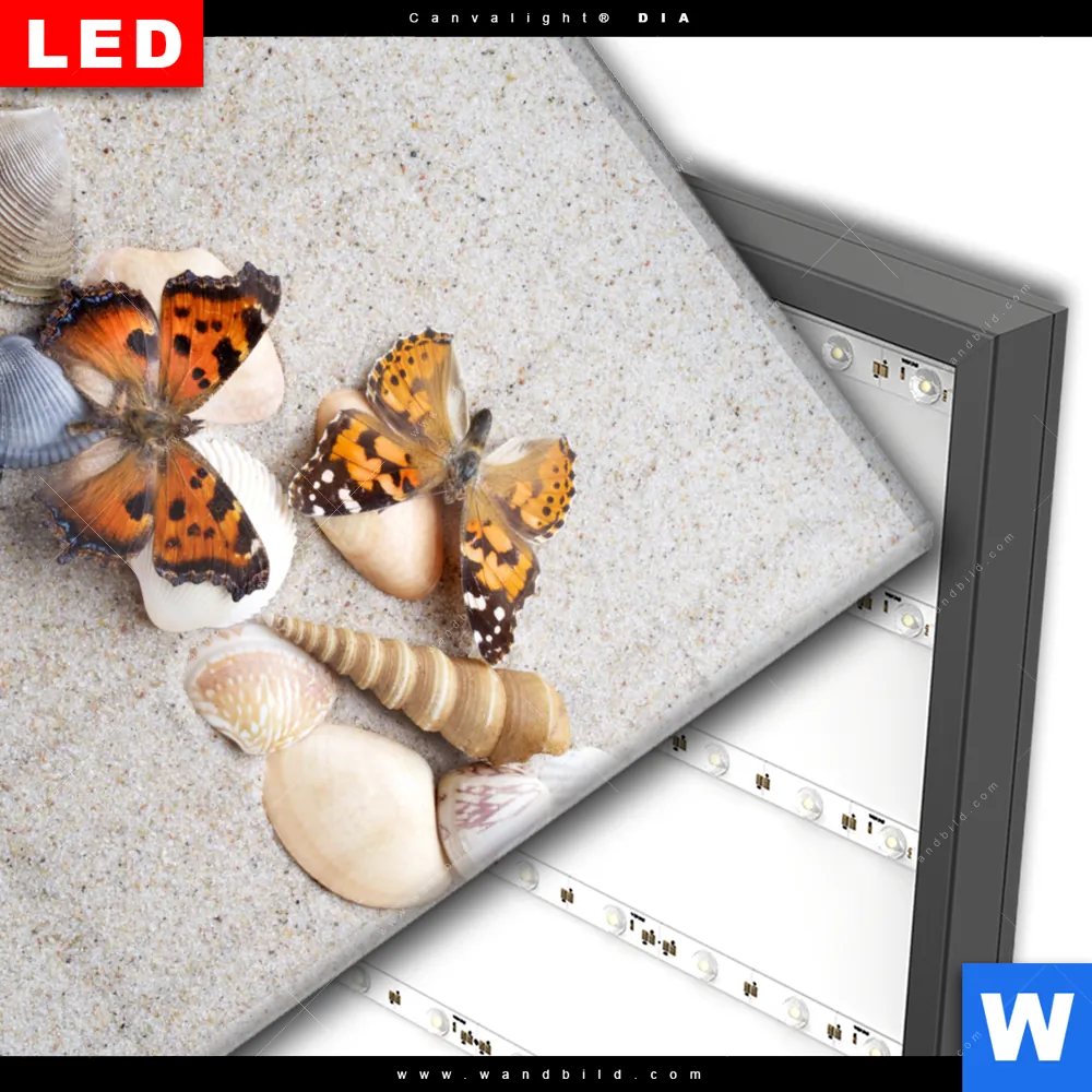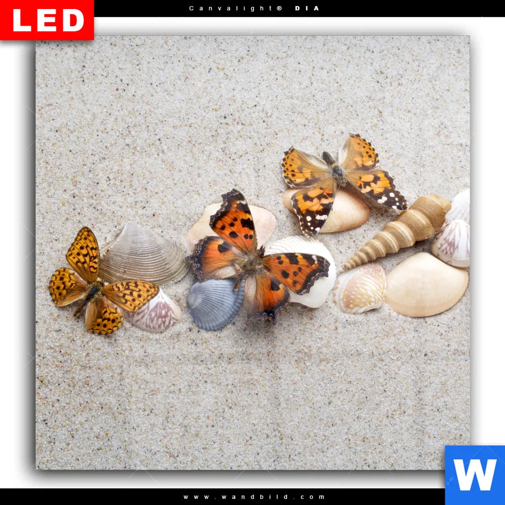 Wechselmotiv Acrylglas Canvalight® DIA | Schmetterlinge & Muscheln im Sand | Quadrat