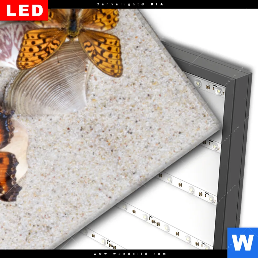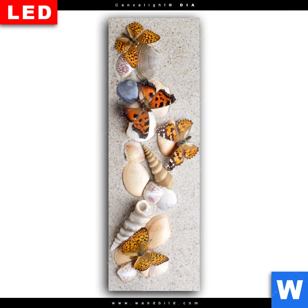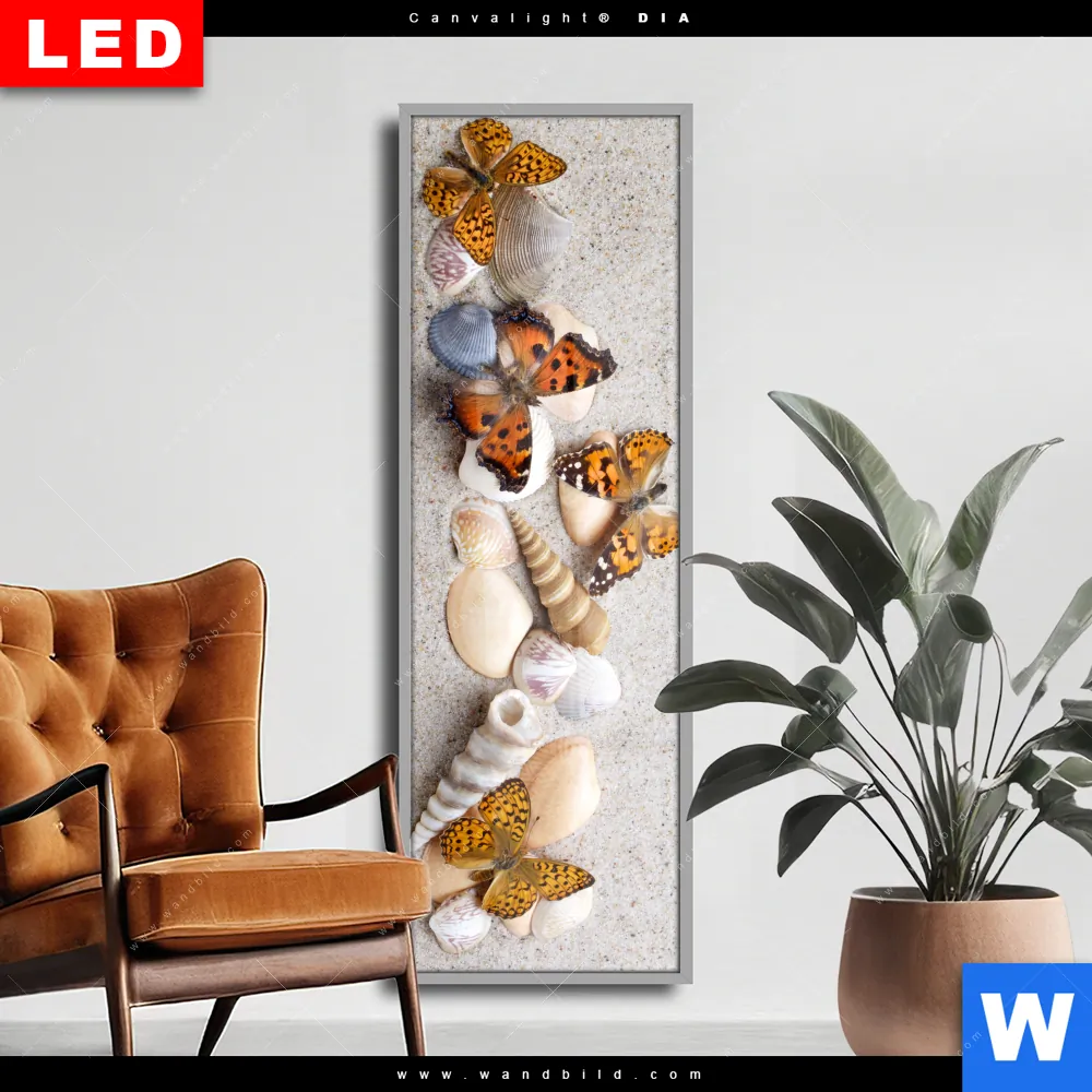 Wechselmotiv Acrylglas Canvalight® DIA | Schmetterlinge & Muscheln im Sand | Schmal