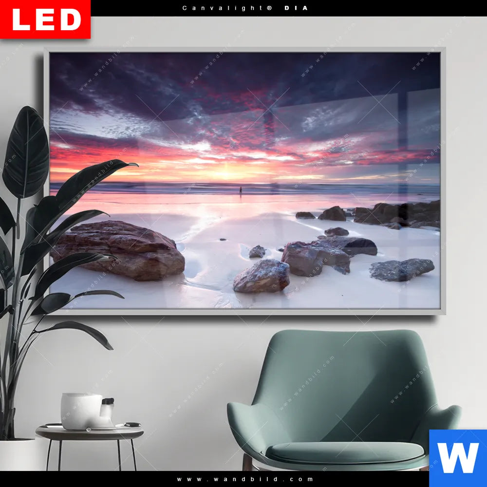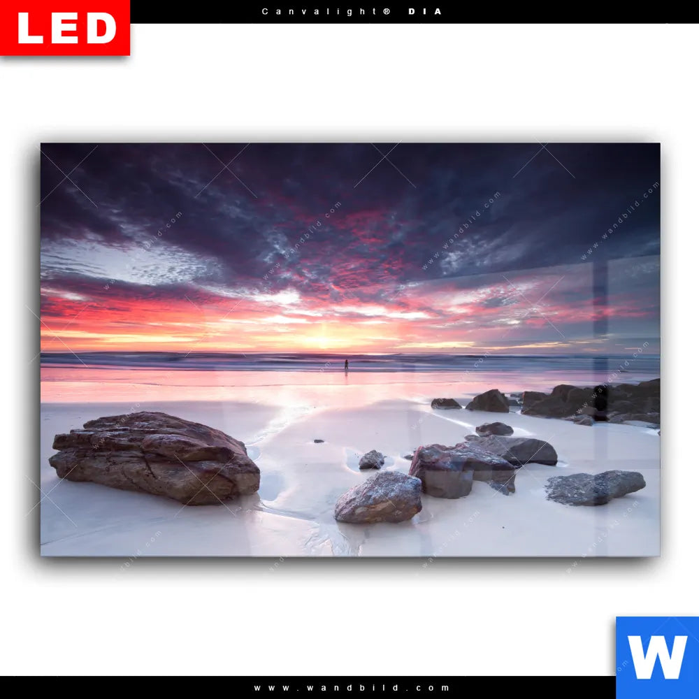 Wechselmotiv Acrylglas Canvalight® DIA | Sonnenaufgang am Strand mit Felsen | Querformat