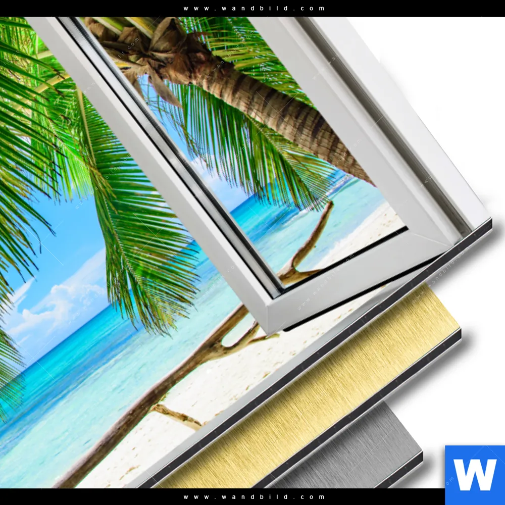 Aluminiumbild gebürstet | Fensterblick Karibik Palme | Querformat
