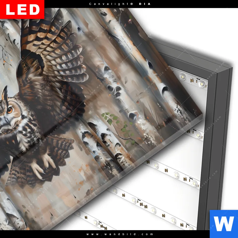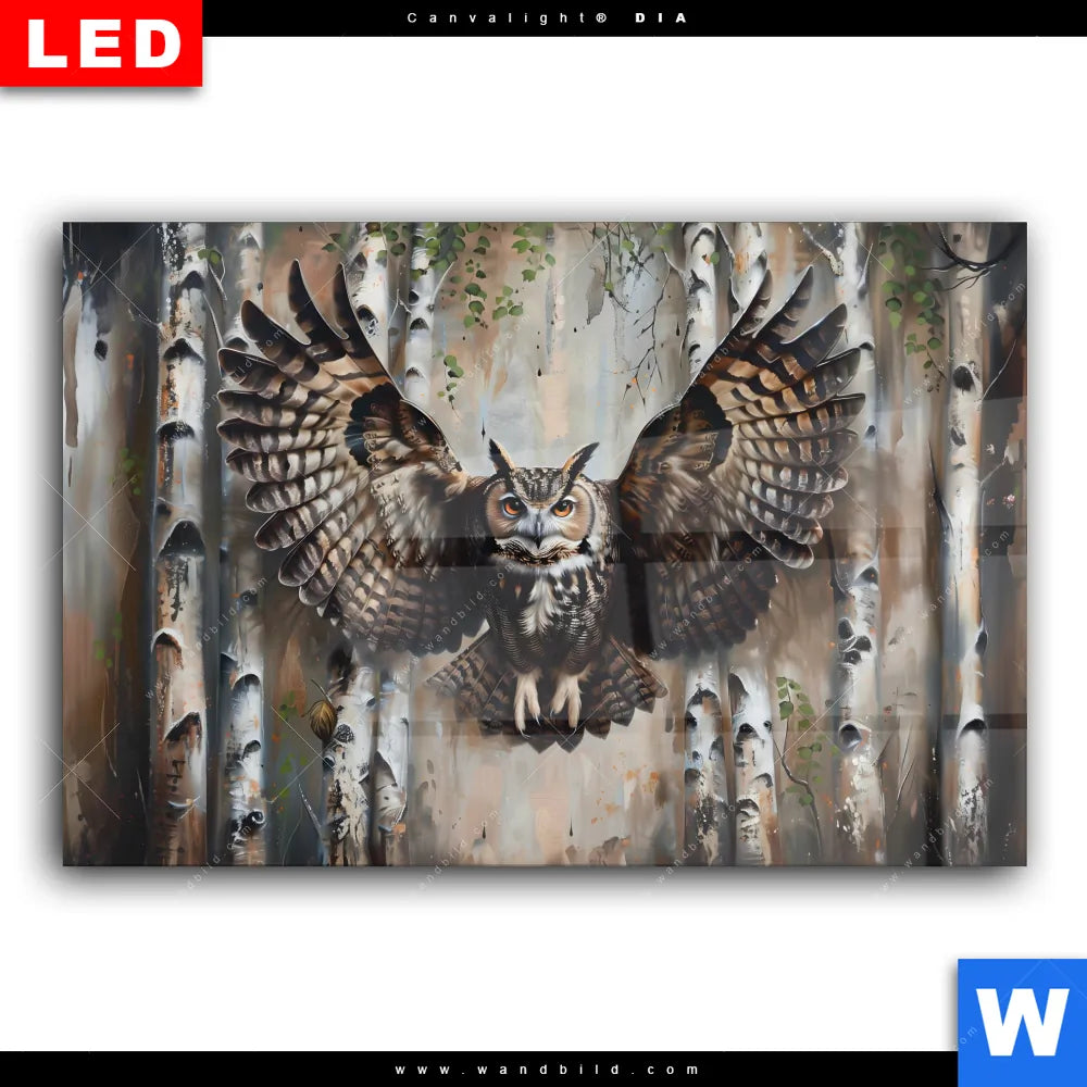 Wechselmotiv Acrylglas Canvalight® DIA | Eule im Birkenwald | Querformat
