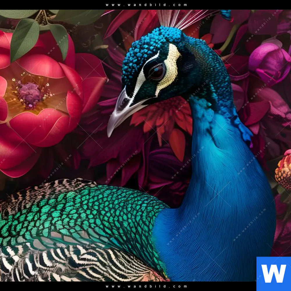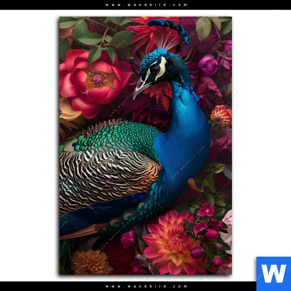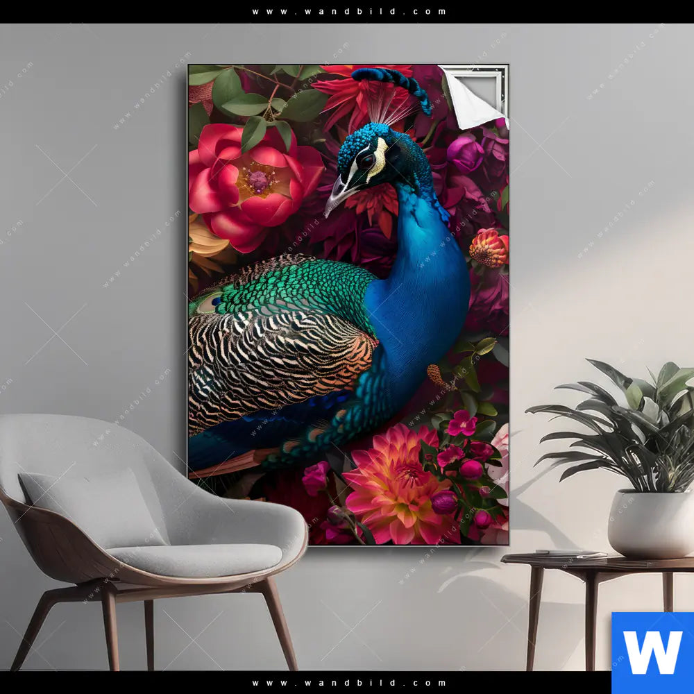 Spannbild | Prachtvoller Pfau und Blüten | Hochformat